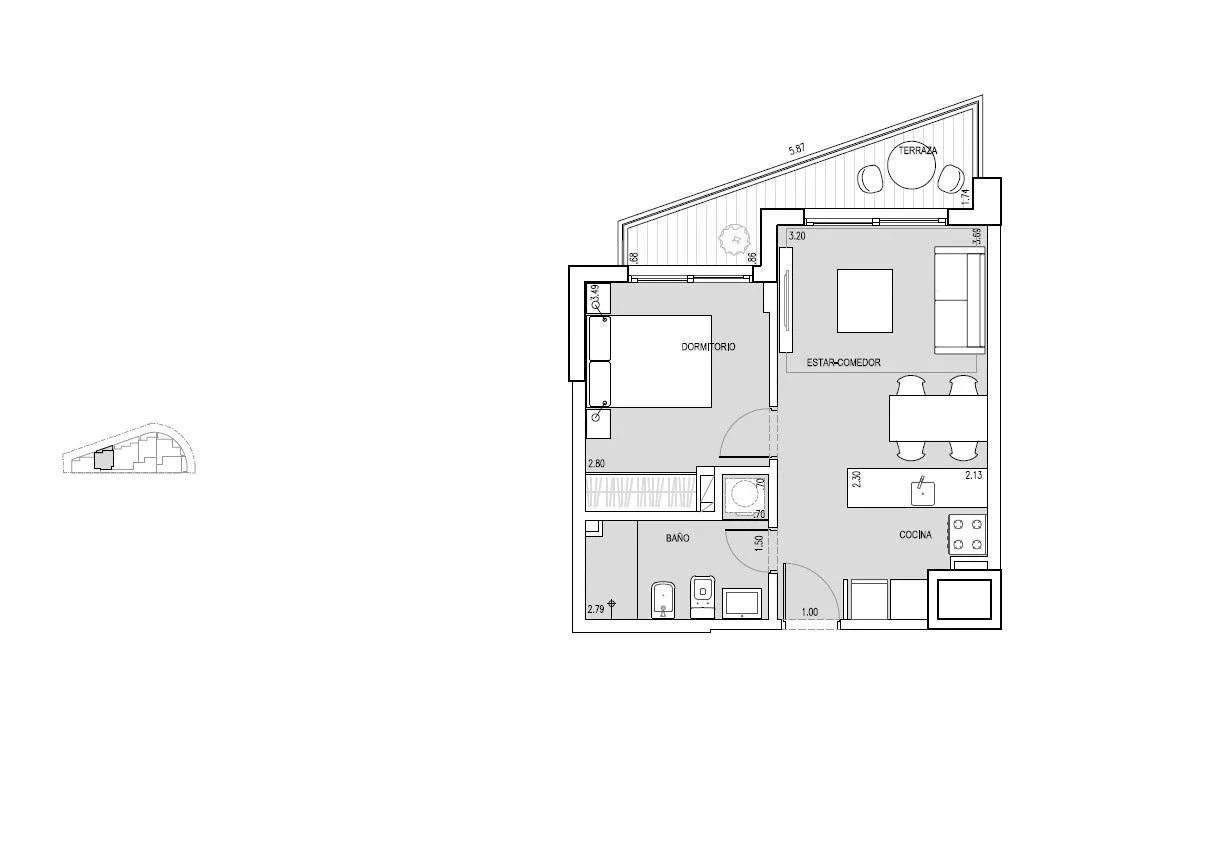 Living comedor con terraza al frente, cocina integrada con placares y conexión para lavarropas y campana. 1 dormitorio al frente con terraza y