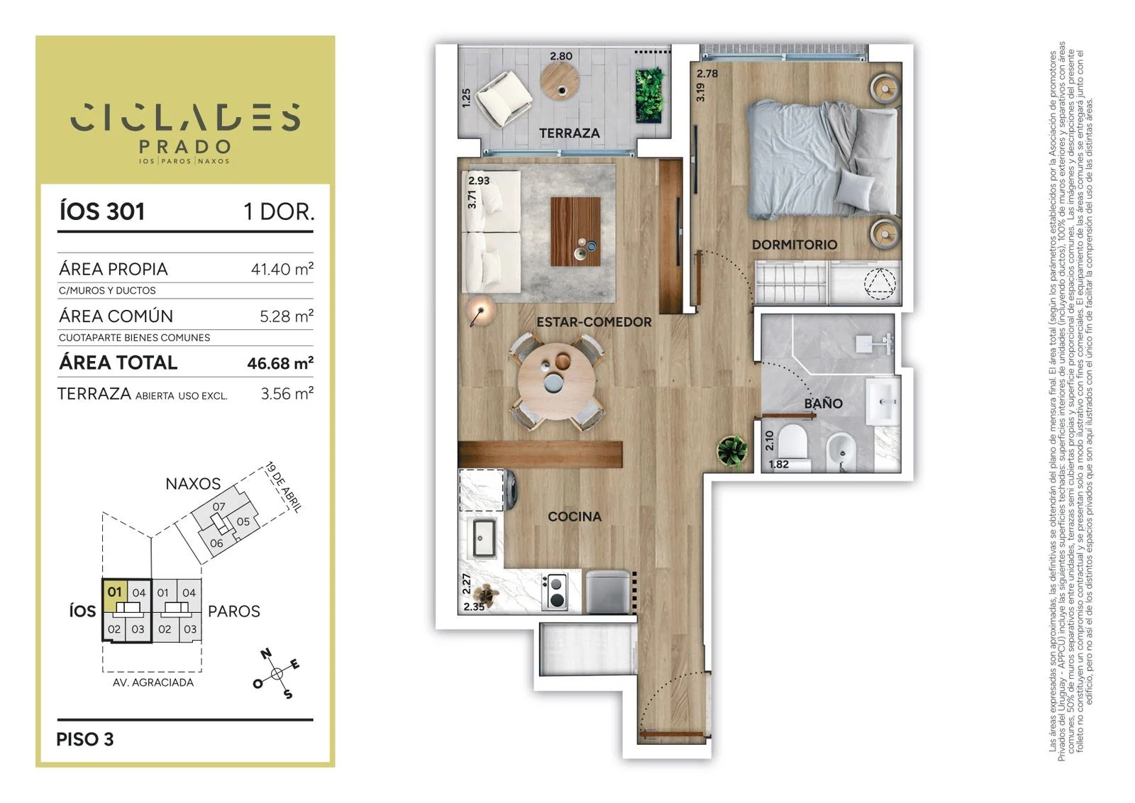 Cíclades Prado es un condominio de tres edificios de planta baja y tres pisos, (ÍOS, PAROS y NAXOS, implantado en un predio que atraviesa la manzana y le abre frente a dos avenidas icónicas del barrio: Av. Agraciada y Av. 19 de Abril.