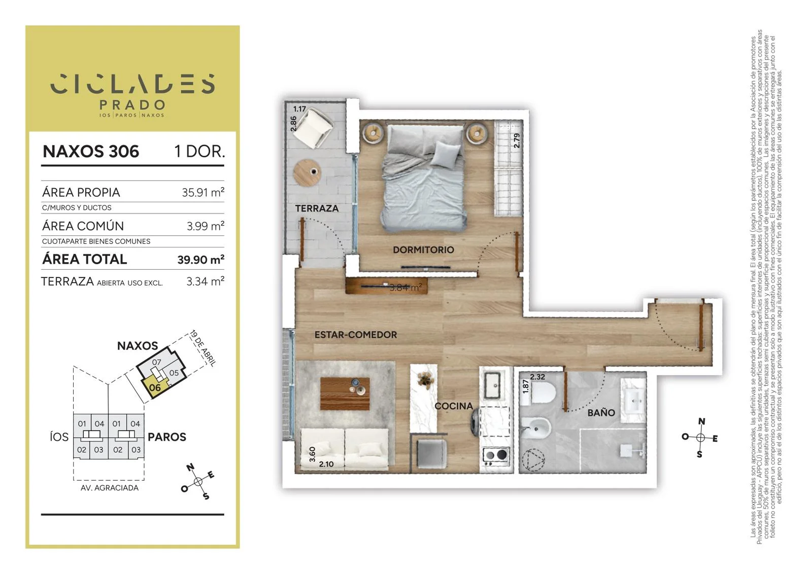 Cíclades Prado es un condominio de tres edificios de planta baja y tres pisos, (ÍOS, PAROS y NAXOS, implantado en un predio que atraviesa la manzana y le abre frente a dos avenidas icónicas del barrio: Av. Agraciada y Av. 19 de Abril.