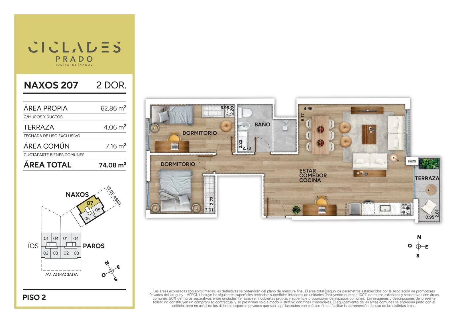 Cíclades Prado es un condominio de tres edificios de planta baja y tres pisos, (ÍOS, PAROS y NAXOS, implantado en un predio que atraviesa la manzana y le abre frente a dos avenidas icónicas del barrio: Av. Agraciada y Av. 19 de Abril.