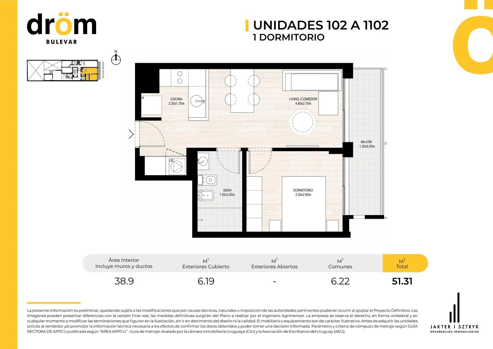Al ingresar al apartamento nos encontramos con la cocina semi-integrada al living comedor, a la derecha encontramos 1 baño completo y 1 dormitorio con placard. Tanto desde el living como desde el dormitorio se accede a una cómoda terraza al frente de más de 6 metros, con vista despejada desde el piso 10.