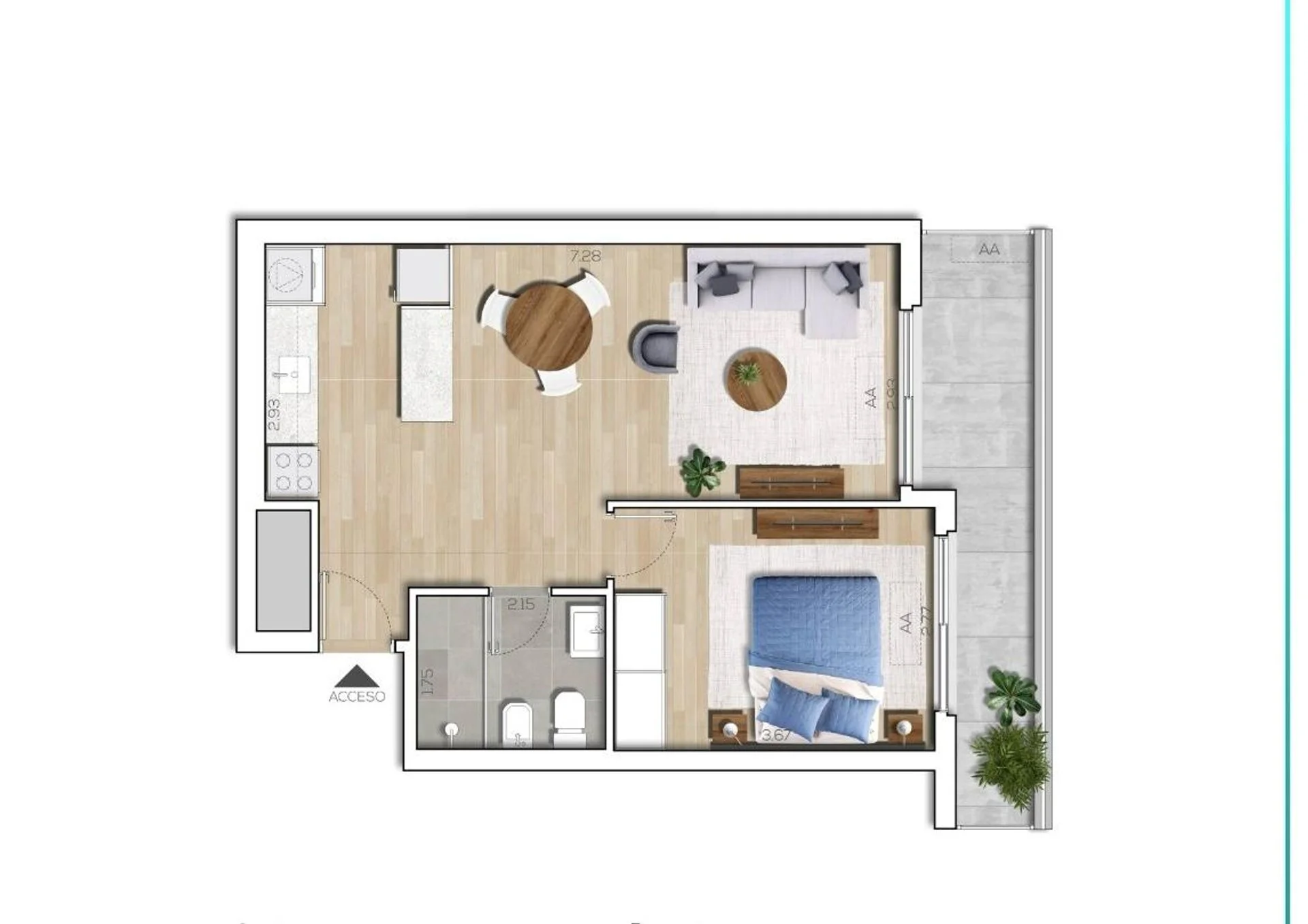• Distribución: living comedor, cocina integrada, 1 dormitorio, 1 baño completo