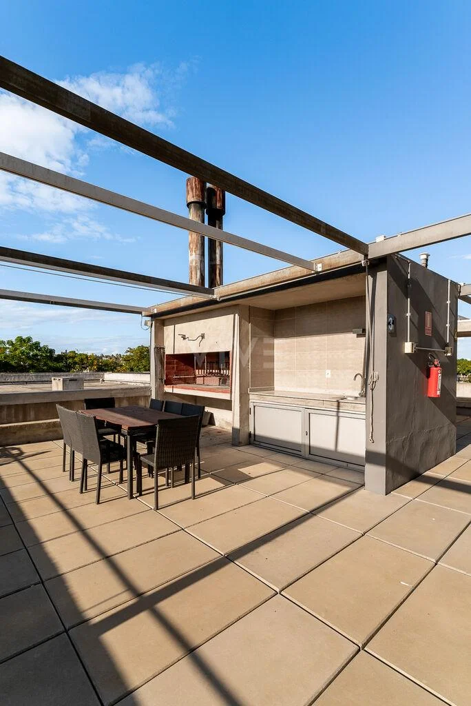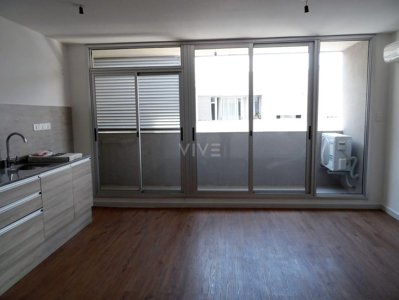 Living comedor con cocina integrada, aire acondicionado y salida a amplia terraza.