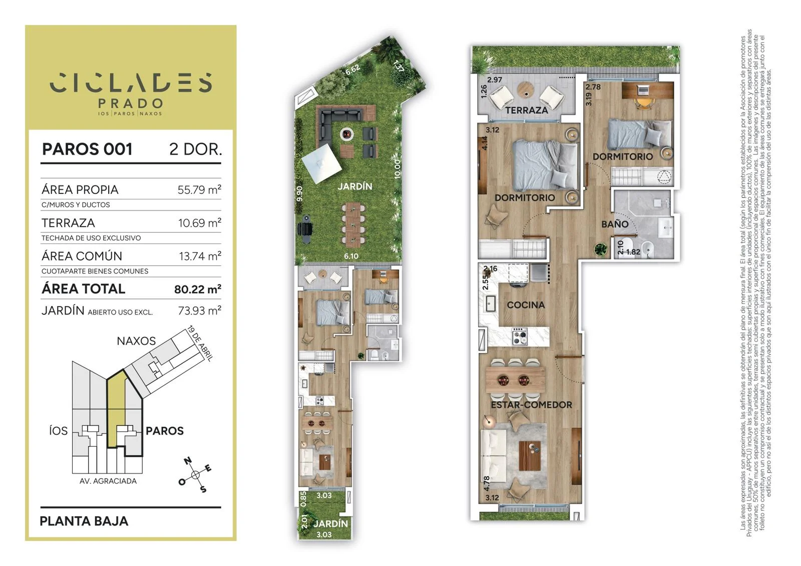 Cíclades Prado es un condominio de tres edificios de planta baja y tres pisos, (ÍOS, PAROS y NAXOS, implantado en un predio que atraviesa la manzana y le abre frente a dos avenidas icónicas del barrio: Av. Agraciada y Av. 19 de Abril.
