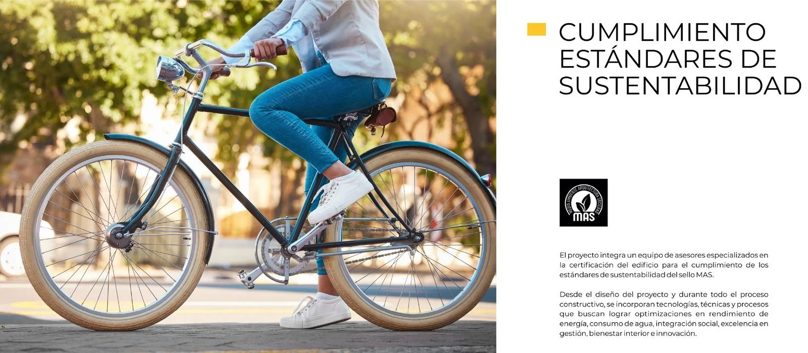 Estándares de sustentabilidad: El proyecto integra un equipo de asesores especializados en la certificación del edificio para los estándares de sustentabilidad del sello MÁS. Desde el diseño del proyecto y durante todo el proceso constructivo se incorporan tecnologías, técnicas y procesos que buscan lograr optimizaciones en rendimiento de energía, consumo de agua, integración social, excelencia en gestión, bienestar interior e innovación.