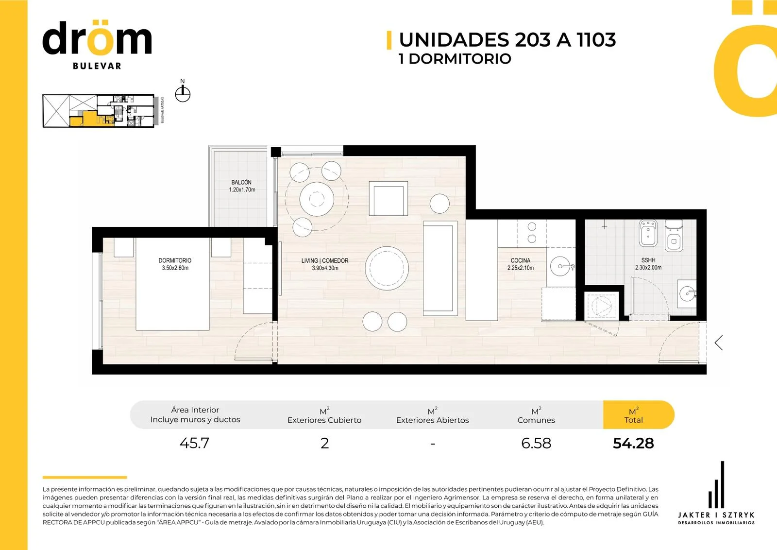 La torre está compuesta por 22 unidades de 1 dormitorio y 11 unidades de 2 dormitorios, y tiene amenities como seguridad de CCTV, Wifi en áreas comunes, barbacoa con parrillero, rooftop, sala co-work, laundry, previsión para cargador vehicular eléctrico, y bike parking.