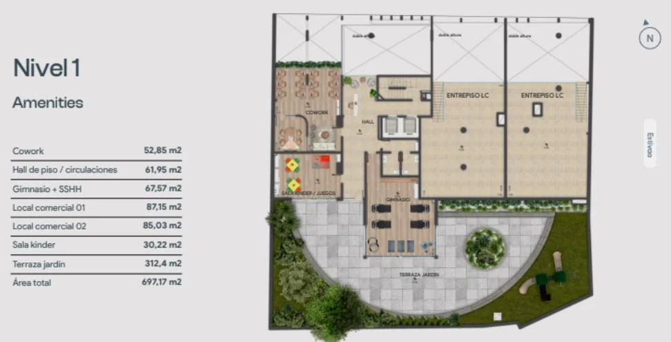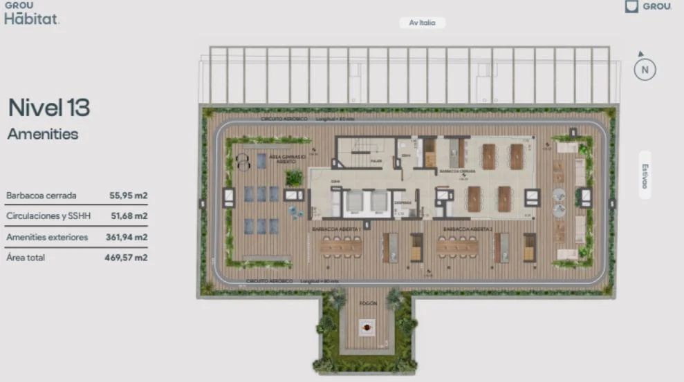 EXCEPCIONALES AMENITIES: SUM CON PARRILLERO - ÁREA FITNESS OUTDOOR - SECTOR DE FUEGOS - 2 PARRILLEROS OUTDOOR - CIRCUITO AERÓBICO (80M) - ÁREA CO-WORK - SALA KINDER/ PLAYRROM - ÁREA FITNESS INDOOR - LAUNDRY - BIKE PARKING