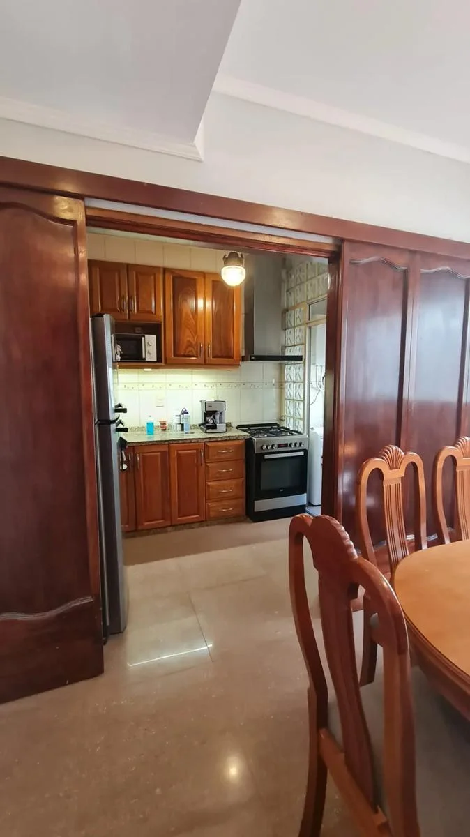 Cuenta con sala de estar y recibidor amueblados, ambos con aire acondicionado, amplios ventanales dobles y salida a un balcón con vista despejada. El comedor principal es definido, espacioso y amueblado, con piso de porcelanato.