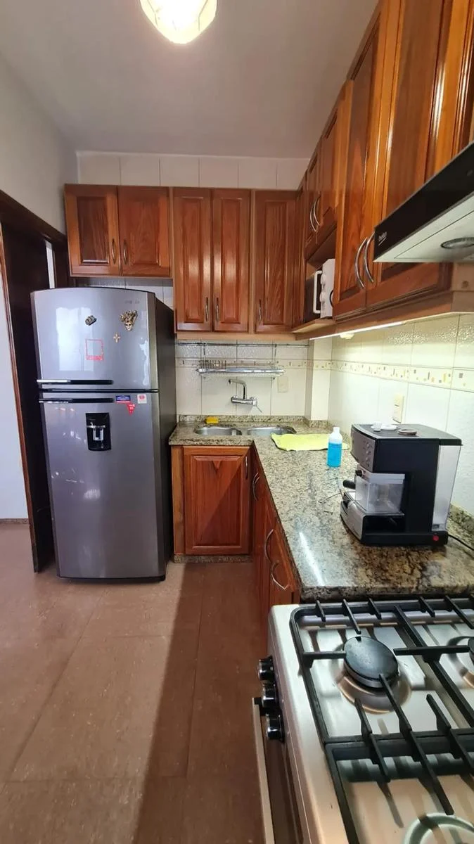 La cocina es definida, con mesada de mármol, muebles bajo y sobre mesada, muy bien equipada y con terraza lavadero. Los dos dormitorios se ubican al frente, amueblados, con dobles ventanas amplias y excelente entrada de luz natural.