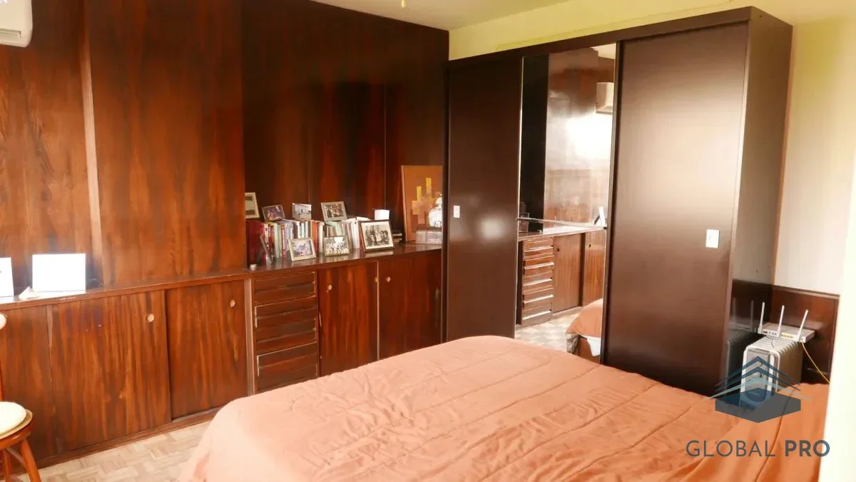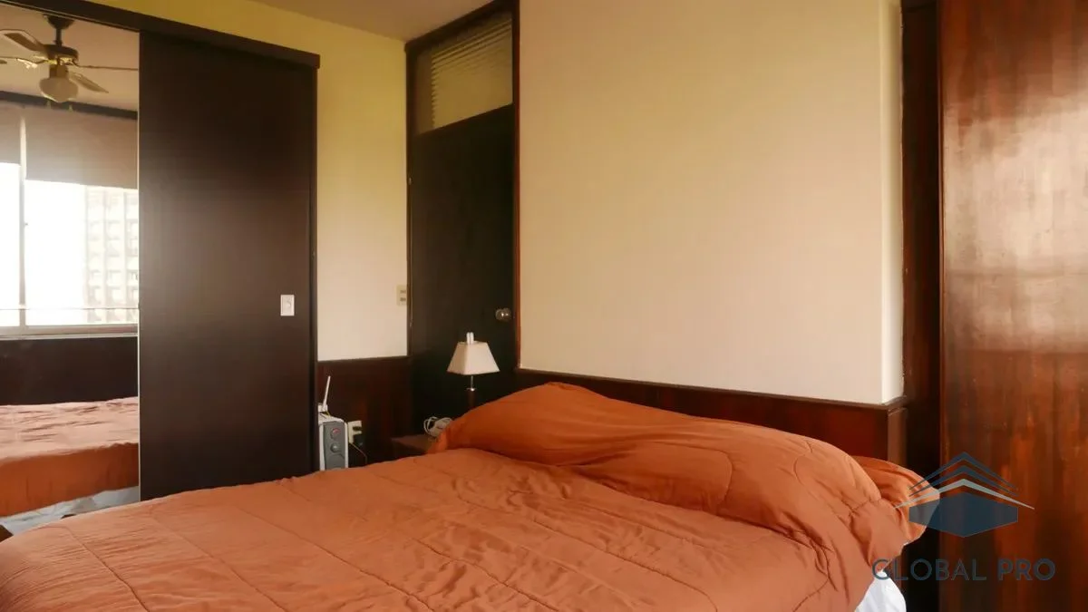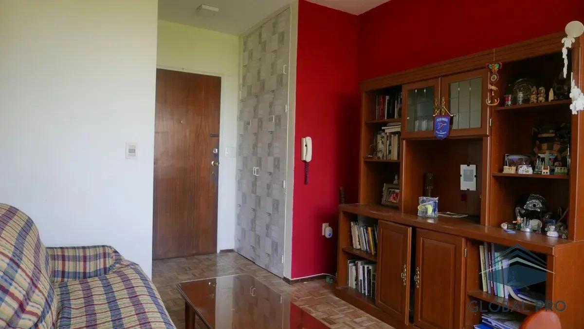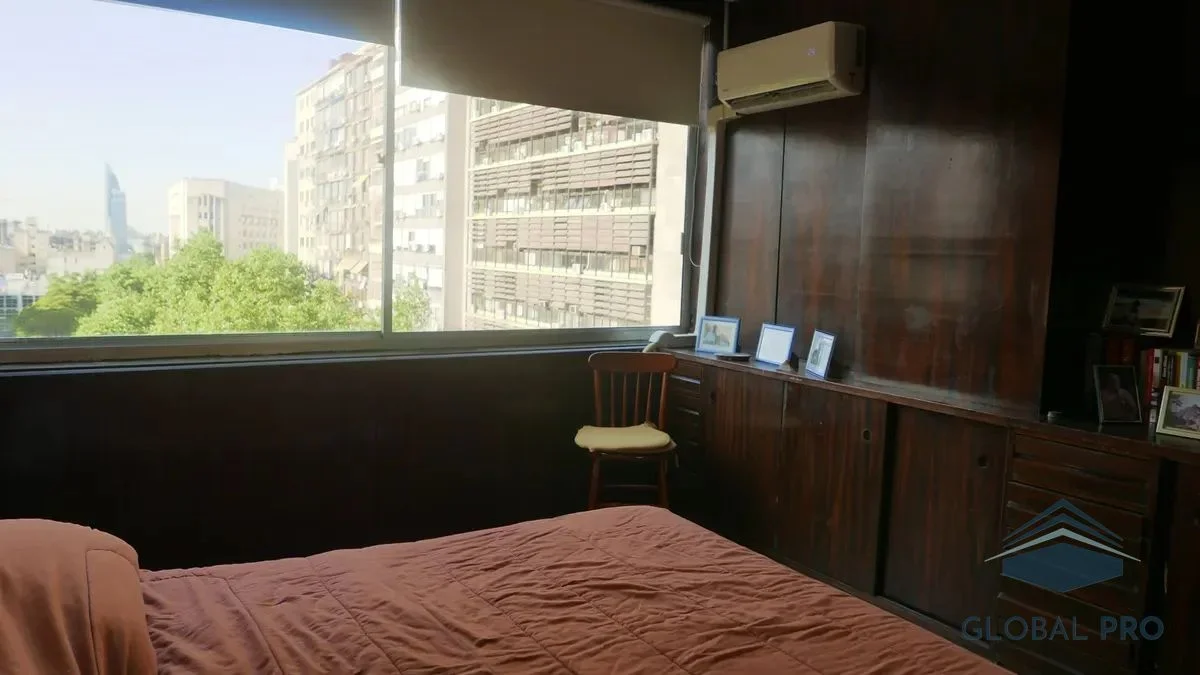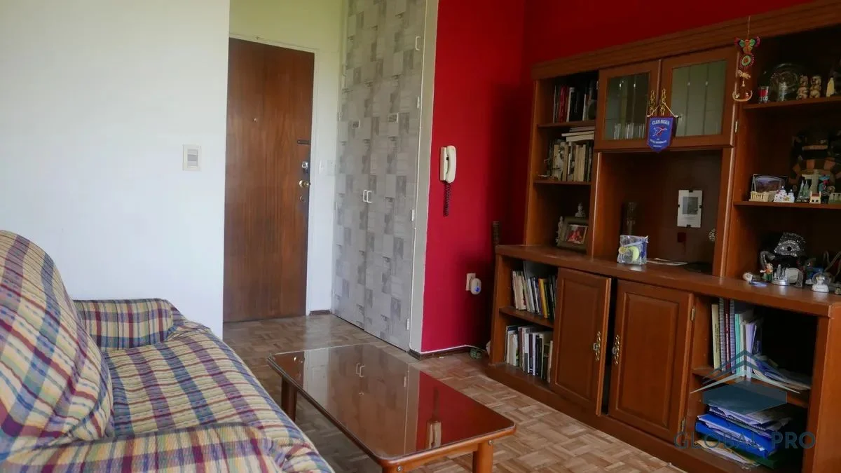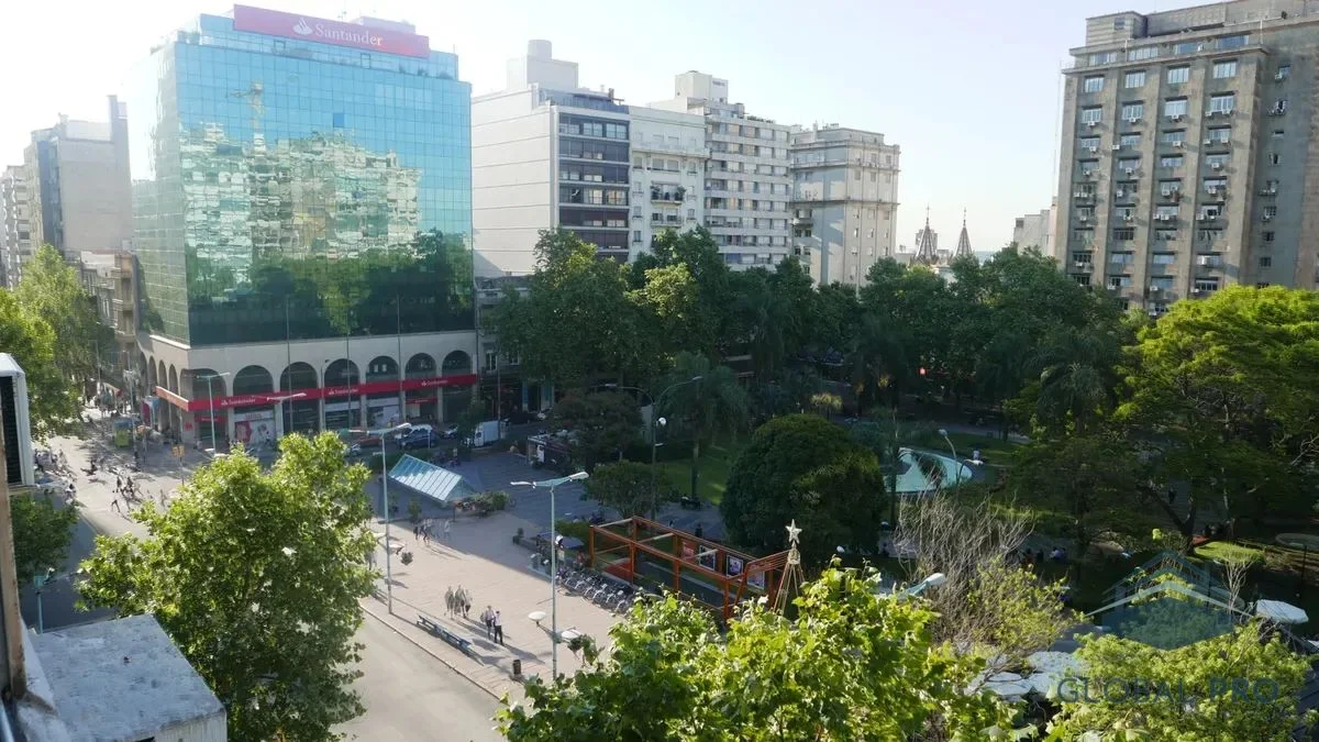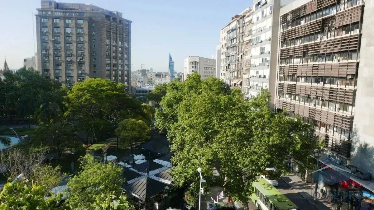 El apartamento destaca por su luminosidad y calidez, gracias a sus amplios ventanales que ofrecen una vista despejada hacia la plaza. Con una orientación norte, este espacio es ideal para disfrutar de la luz natural durante todo el día. Equipado con aire acondicionado, el inmueble cuenta con un dormitorio que incluye un placar y una cama de dos plazas, así como un living comedor que se complementa con un sofá cama, un aparador, mesa y cuatro sillas, y un televisor, creando un ambiente acogedor y funcional.