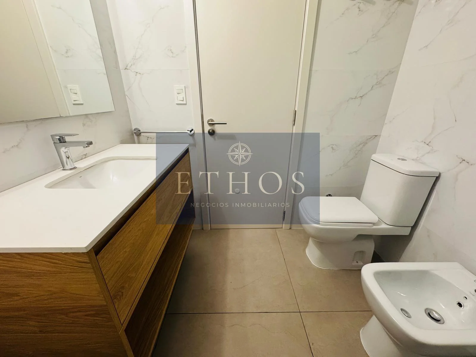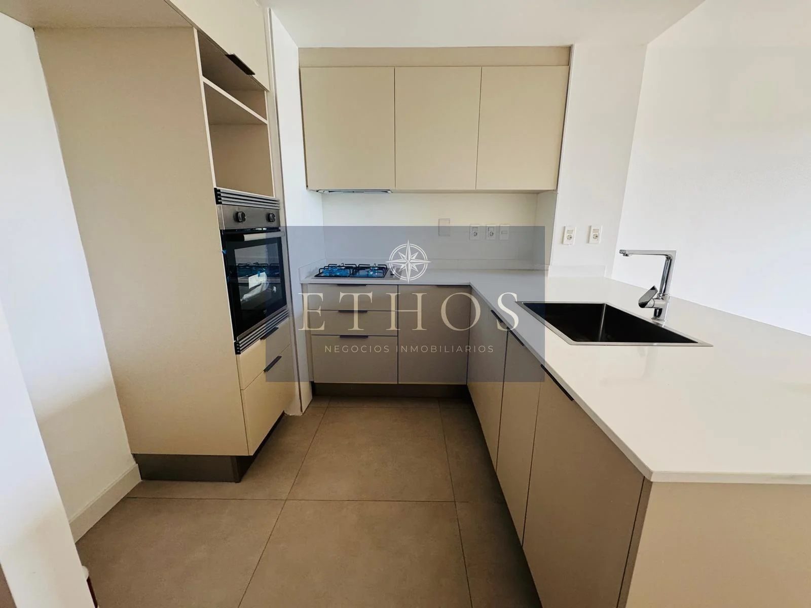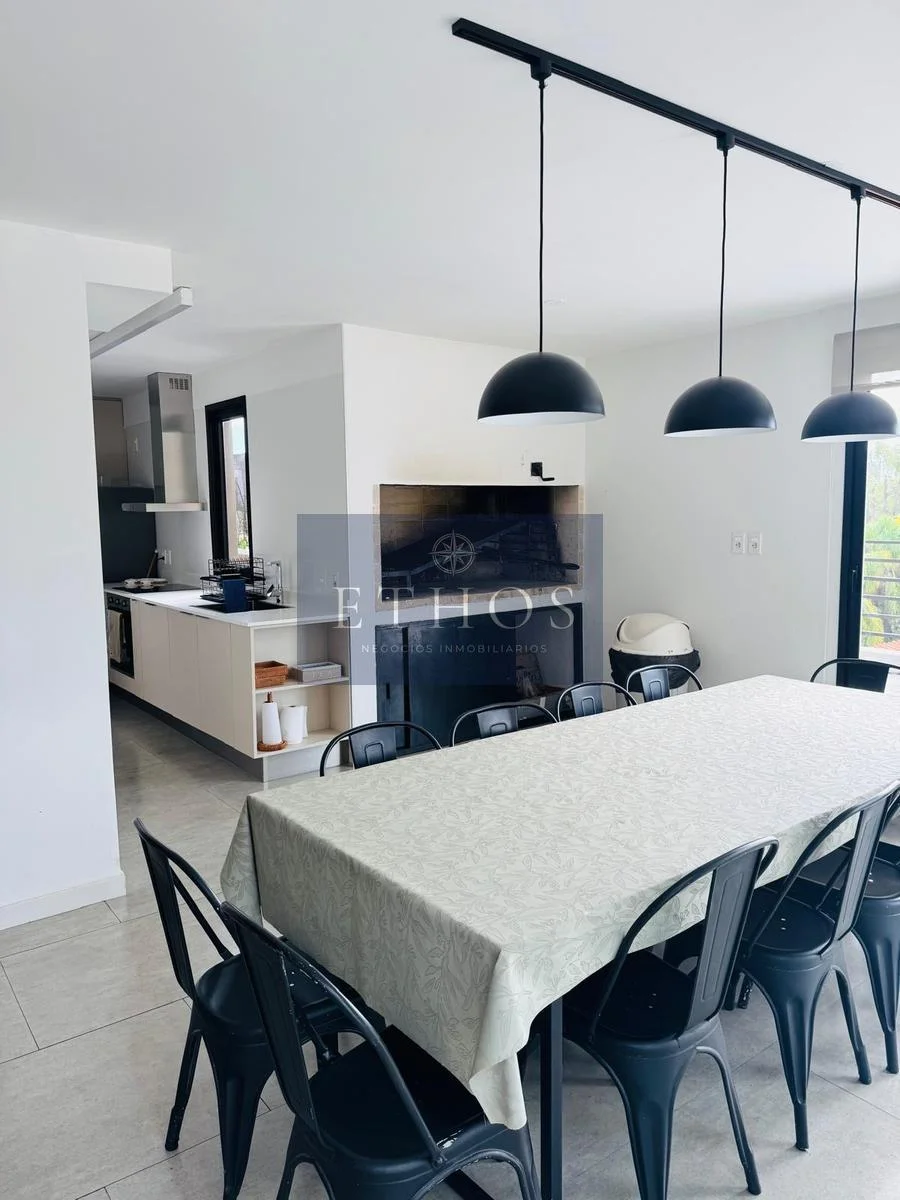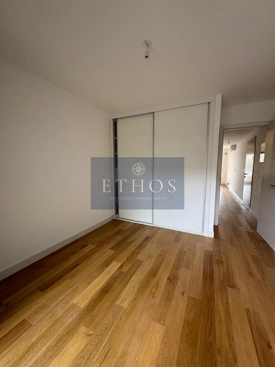 El dormitorio está equipado con cortinas de enrollar de aluminio y amplios placares. La cocina, de diseño moderno, incorpora muebles de la reconocida marca Todeschini, una campana extractora, horno y anafe marca BEKO. Dispone de una caldereta de gas que alimenta el agua caliente en cocina y baño.