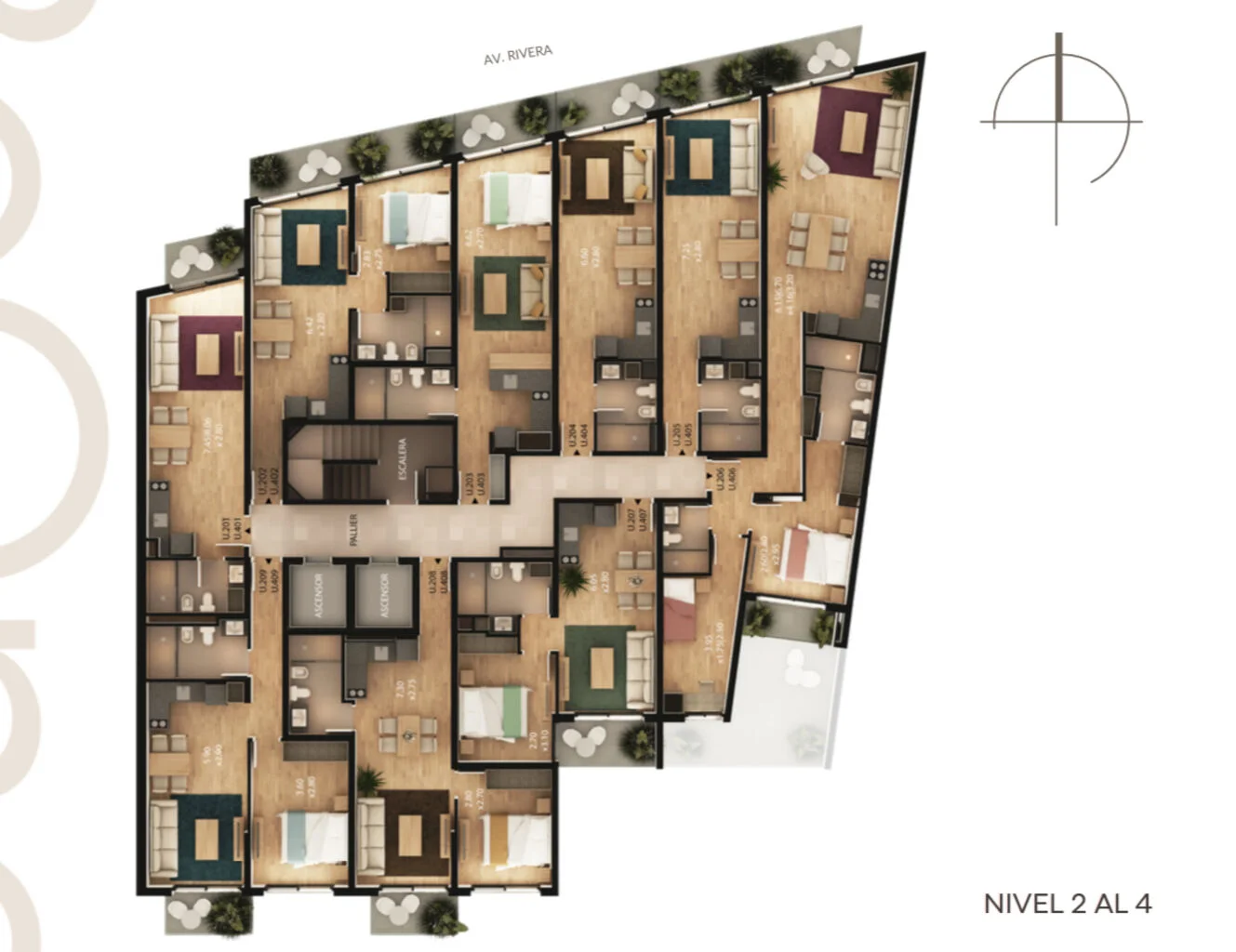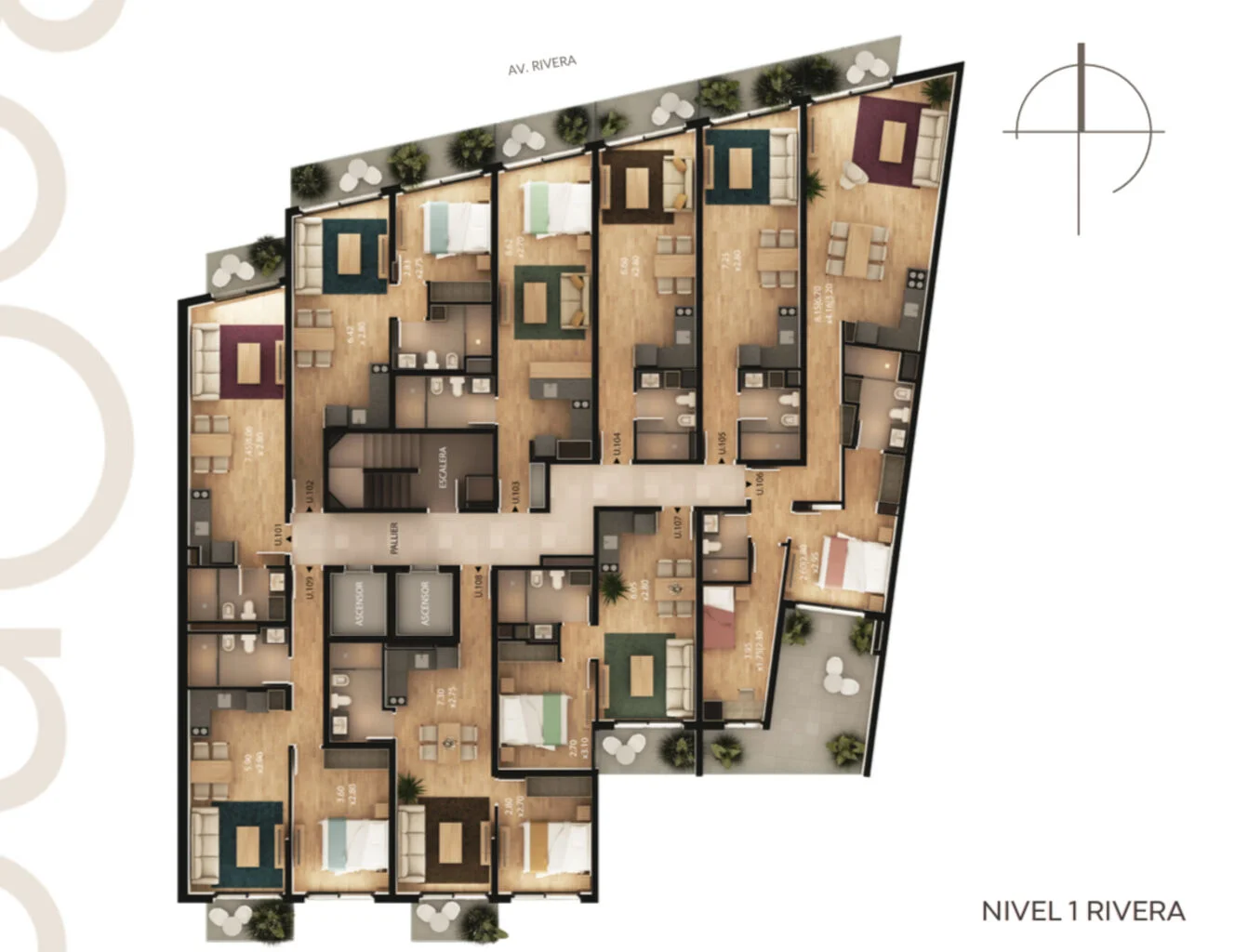 Torre Rivera: 9 niveles que integran 69 apartamentos monoambientes, de 1 y 2 dormitorios.