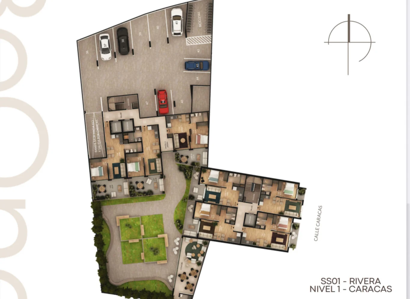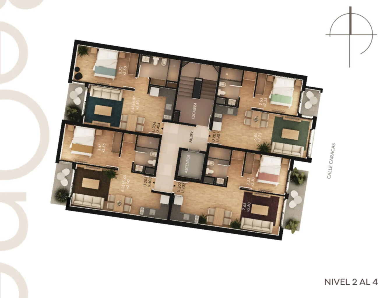 Torre Caracas: 4 niveles con 17 unidades de 1 dormitorio.