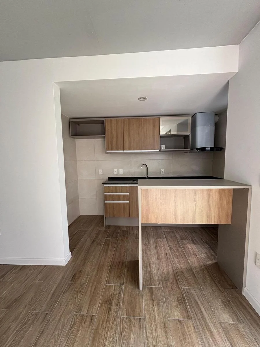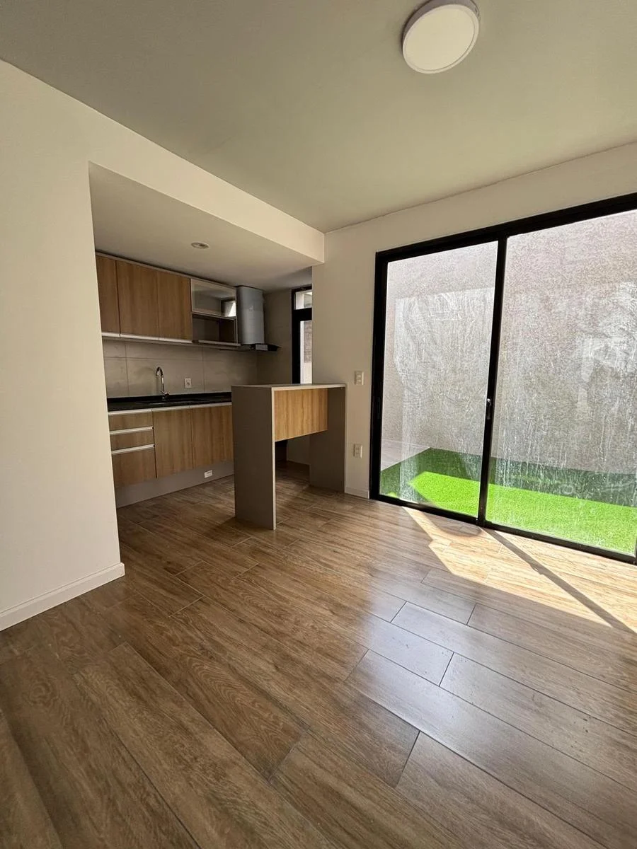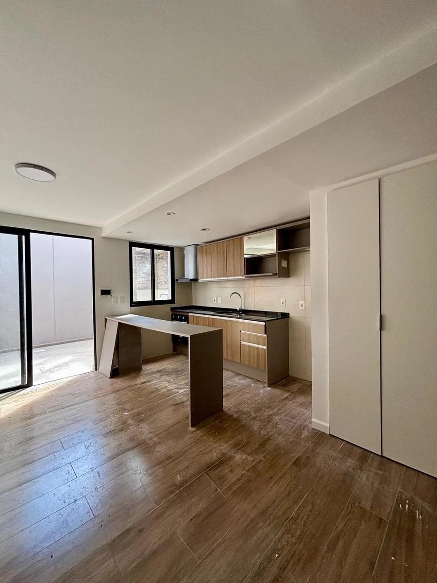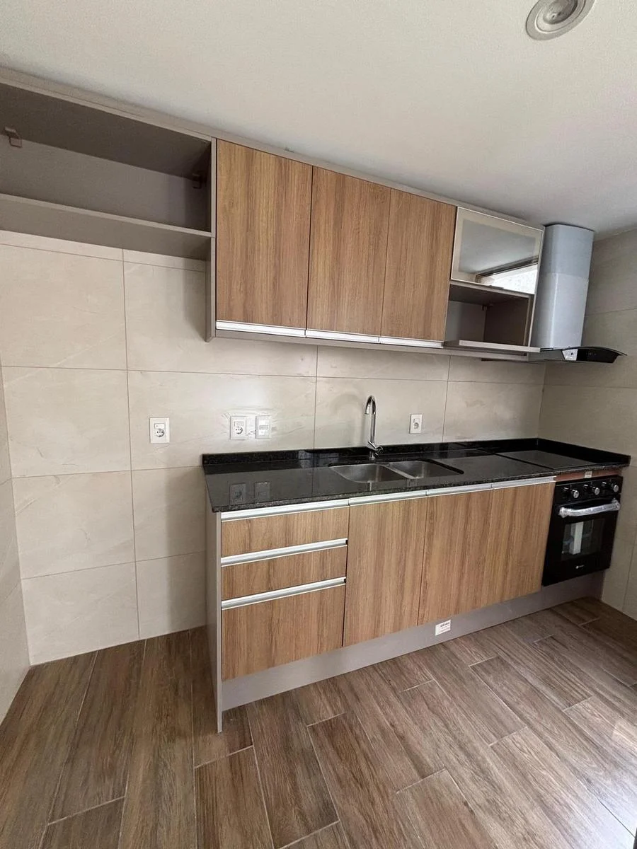Cocina moderna con mesada de granito y muebles incluidos. Equipada con anafe, campana extractora, horno eléctrico y placard en dormitorio