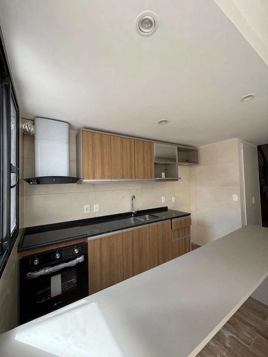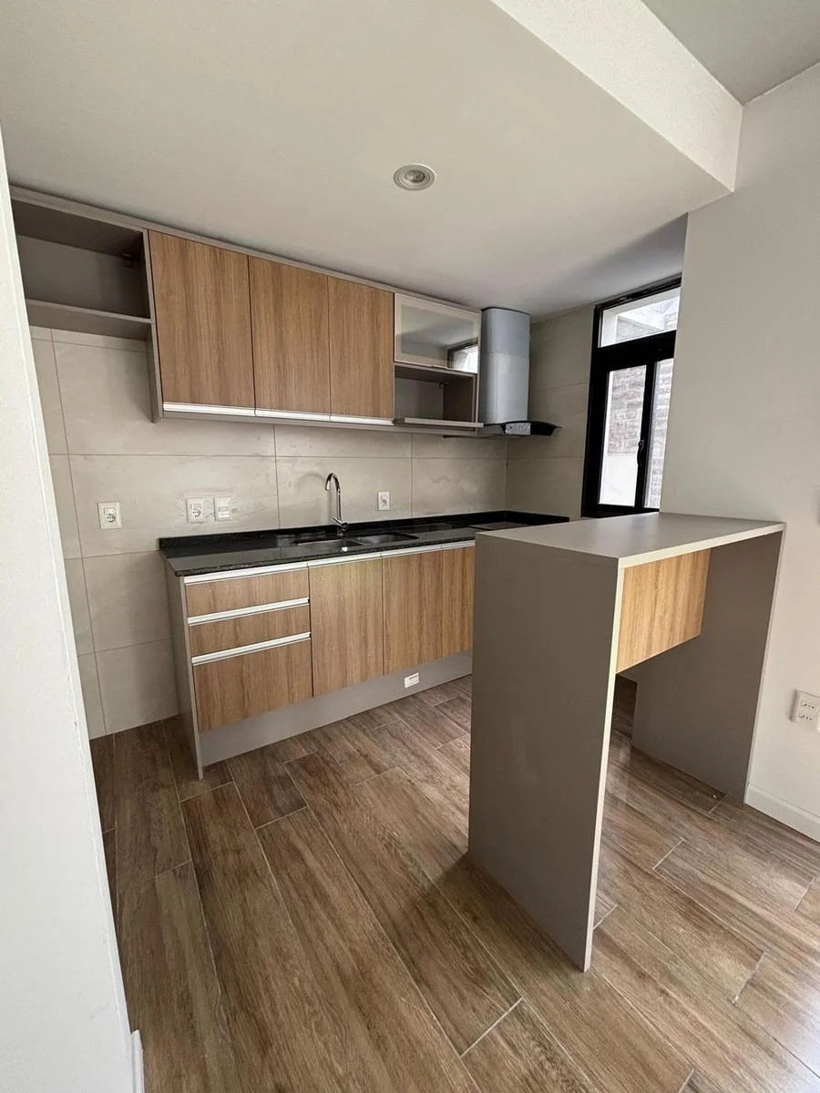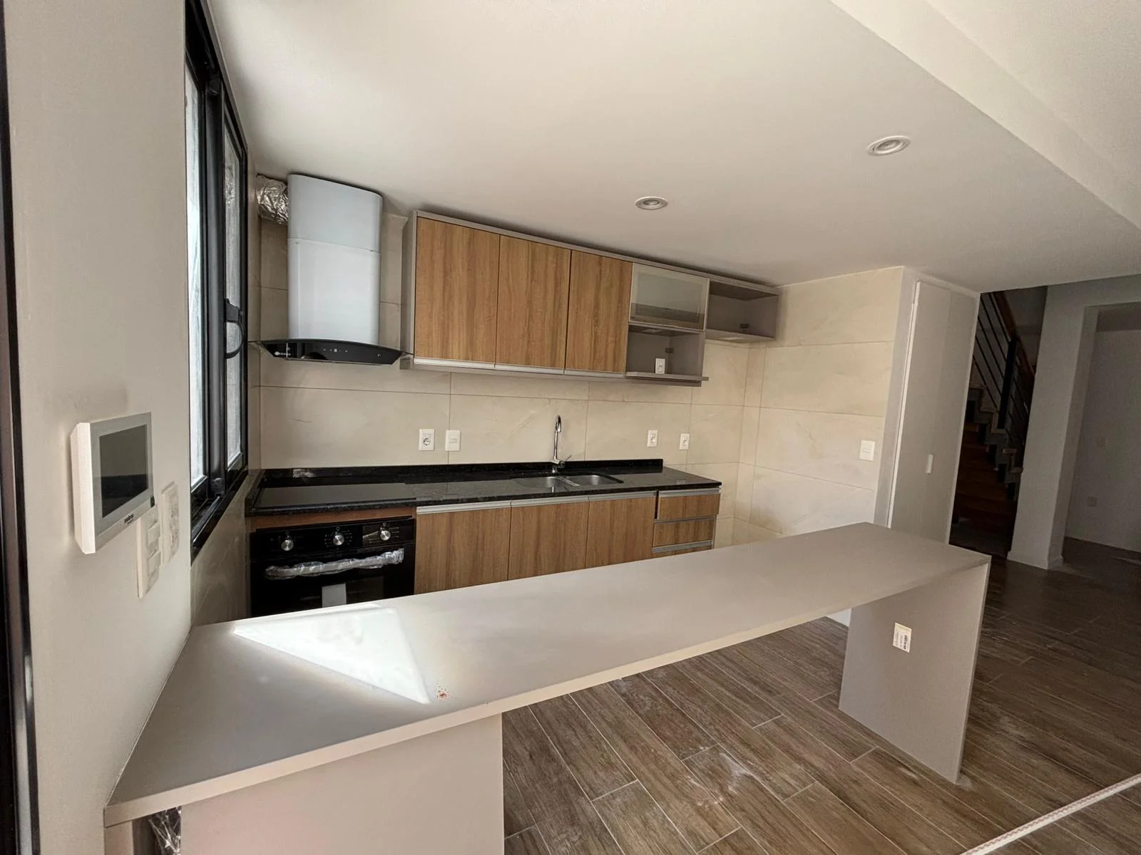 Cocina moderna con mesada de granito y muebles incluidos. Equipada con anafe, campana extractora, horno eléctrico y placard en dormitorio