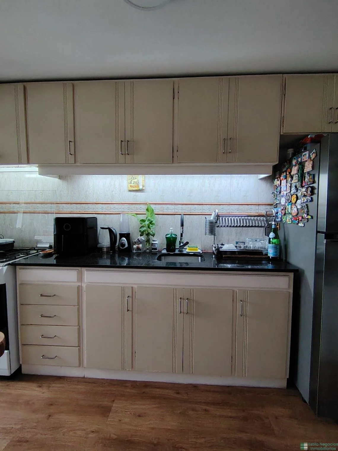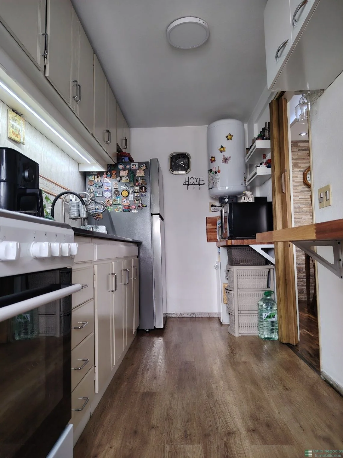 Cocina definida con muebles aéreos y bajo mesada y placares extra.