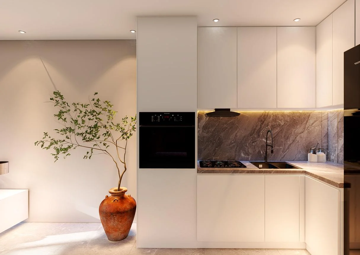 - Cocina de diseño con mesada de granito, anafe y campana de acero inoxidable, grifería de calidad y mobiliario funcional.