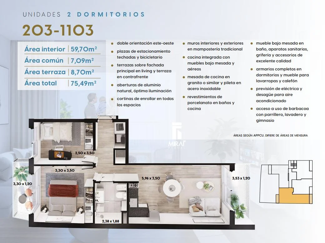 Ubicado en la esquina de la calle Rivera y Arenal Grande, en el corazón del barrio Cordón, se presenta una excepcional oportunidad de inversión en un apartamento a estrenar. Este inmueble destaca por su construcción tradicional y su diseño que maximiza la luminosidad, gracias a su orientación este-oeste y sus amplias ventanas. Con una superficie total de 60 m², de los cuales 60 m² son cubiertos, el apartamento cuenta con dos cómodos dormitorios, un baño completo, una cocina funcional y un acogedor balcón. Además, ofrece el atractivo de un doble terraza, ideal para disfrutar de momentos al aire libre.