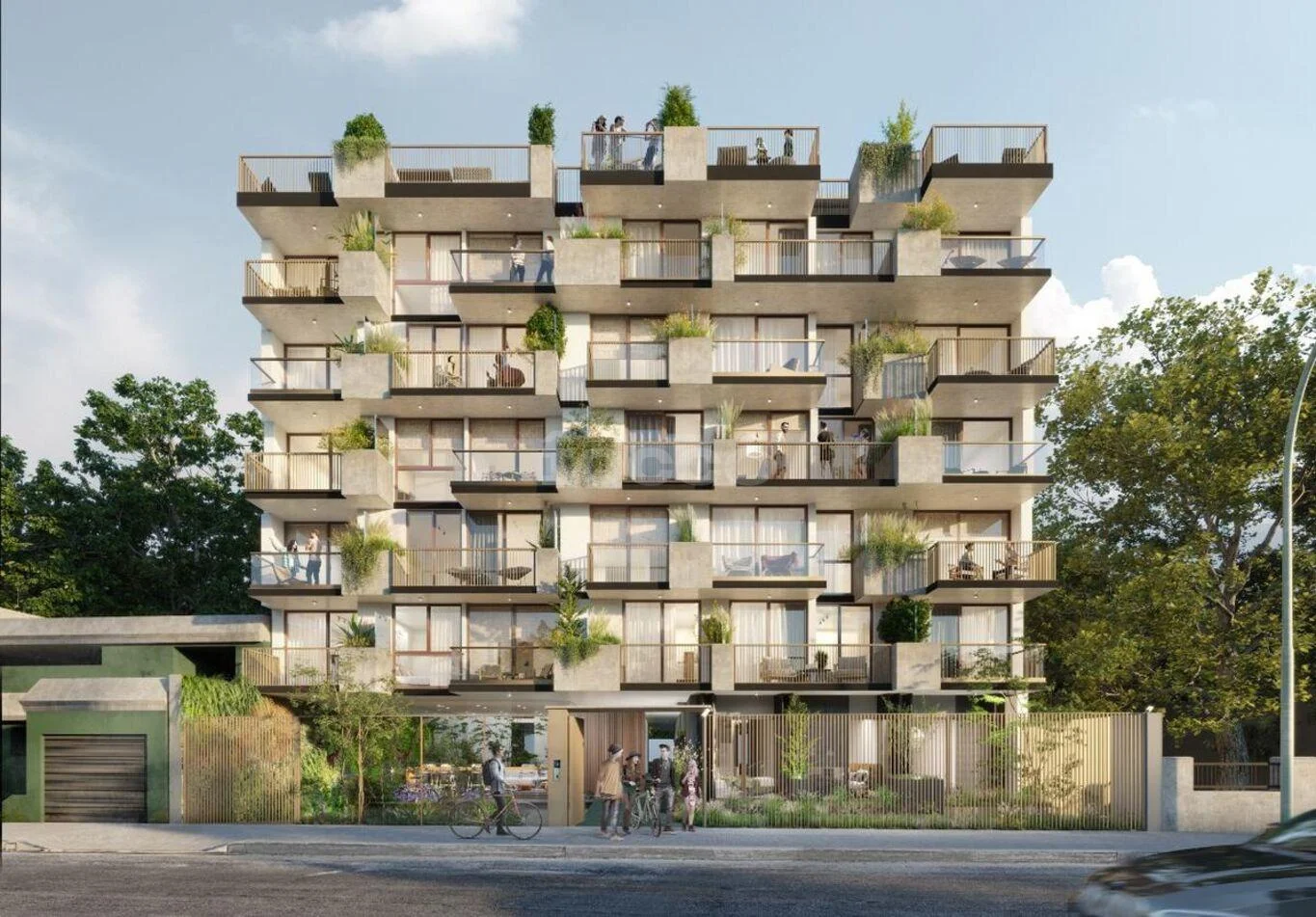 Las unidades se destacan por sus cómodas superficies —desde 71 m² hasta 130 m² totales—, terrazas amplias, jardineras integradas y una orientación que favorece la iluminación natural. Cada apartamento ha sido diseñado con especial atención al confort y a los detalles: equipamiento de calidad, cerraduras electrónicas, control inteligente de luces y preinstalaciones para electrodomésticos y climatización.