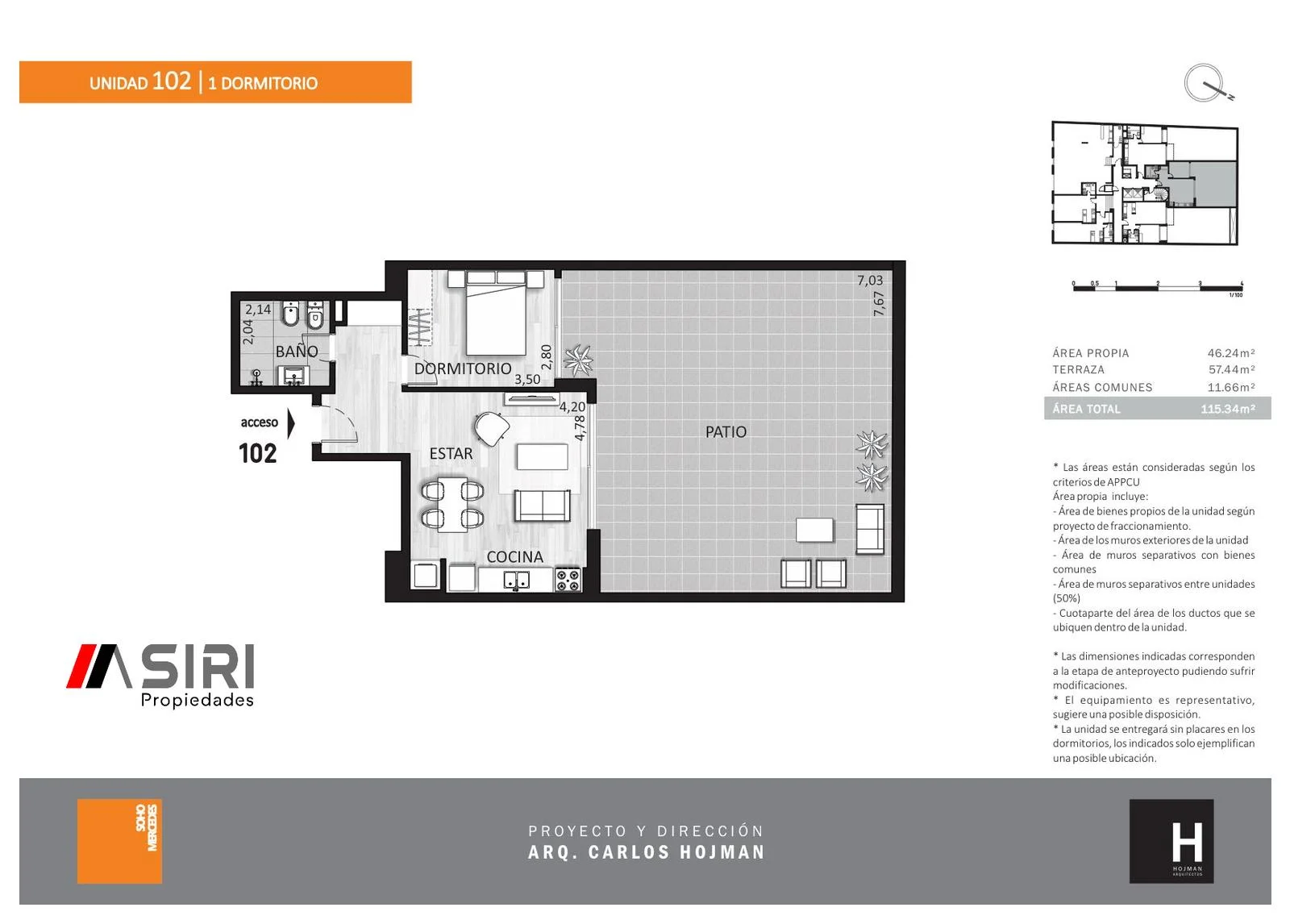 Apartamento de 1 dormitorio, living comedor con cocina integrada, baño completo, de 46.24m² (internos), más una gran terraza de 57.44m².