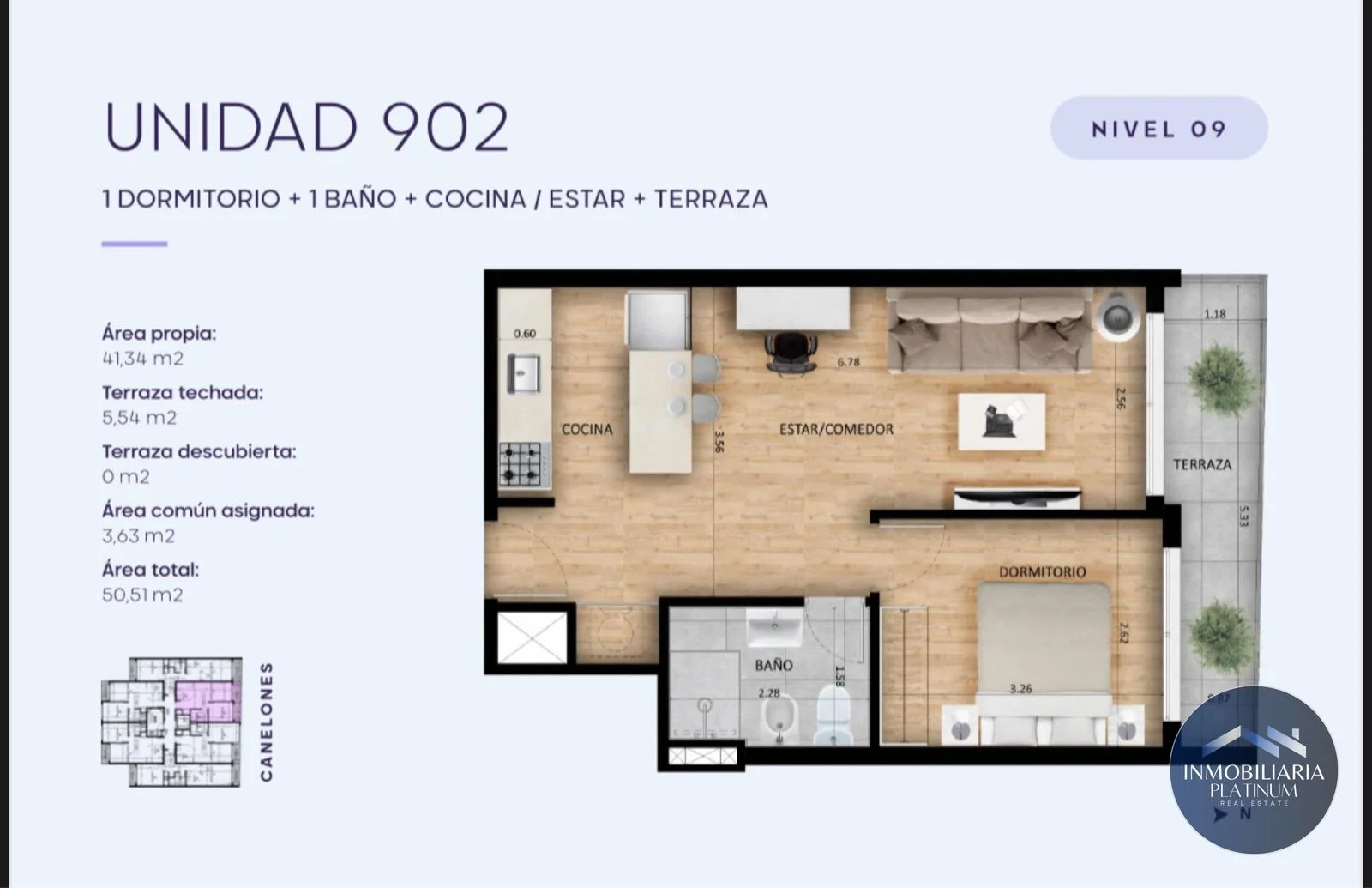 Este apartamento cuenta con una superficie total de 50 m², de los cuales 46 m² son cubiertos, distribuidos en 3 ambientes: 1 dormitorio, 1 baño y cocina. La propiedad se presenta con las siguientes características: