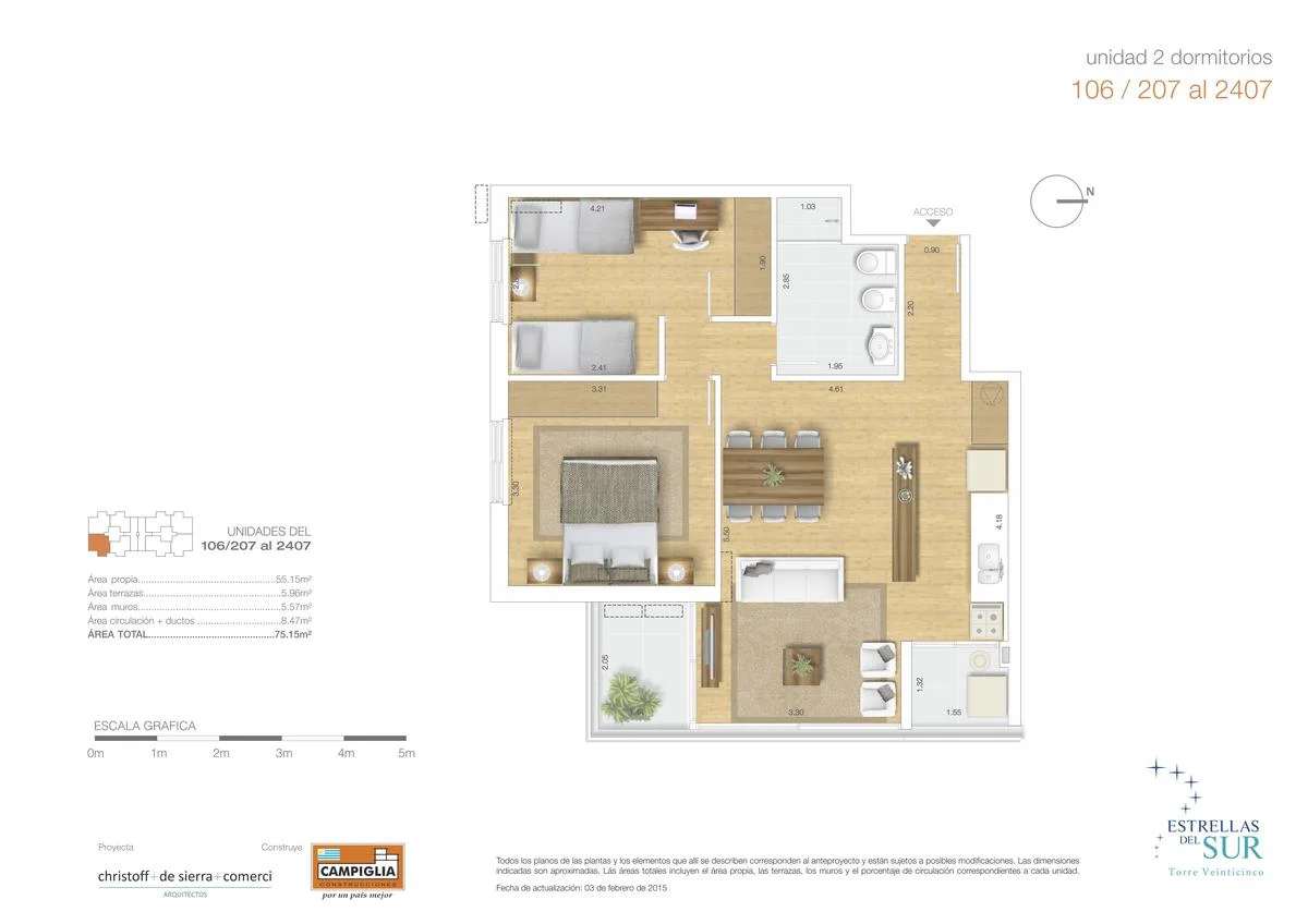Piso 20, living comedor con aire acondicionado, grandes ventanales y terraza. Cocina integrada con muebles aéreos, bajo mesada y doble bacha. Terraza lavadero. 2 dormitorios con placar y aire acondicionado. Baño completo.