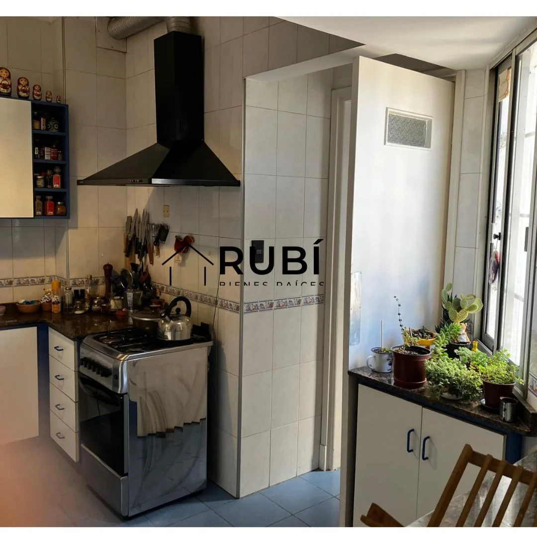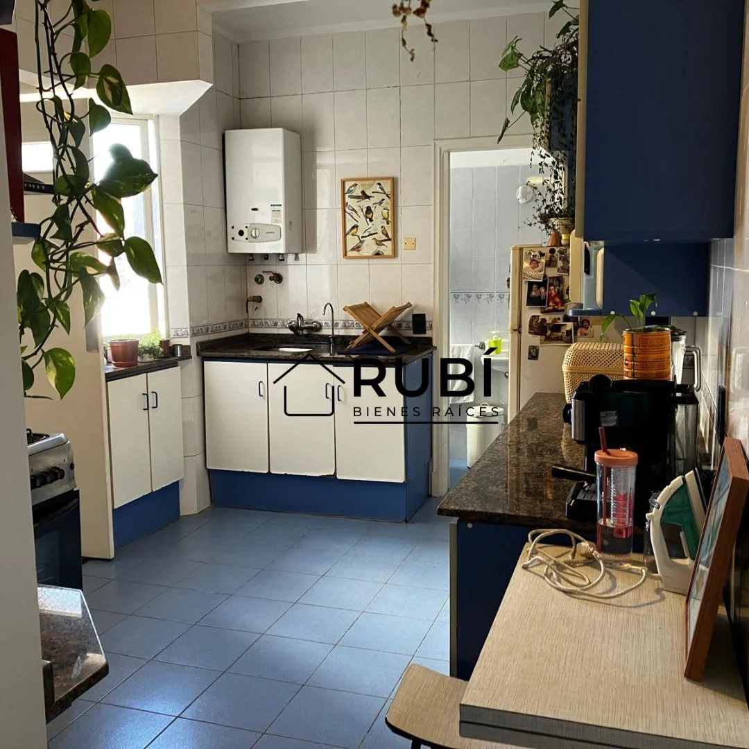 La gran cocina es definida y luminosa ya que tiene ventana para ventilación directa, además tiene campana y muebles en madera aéreos y bajo mesada.