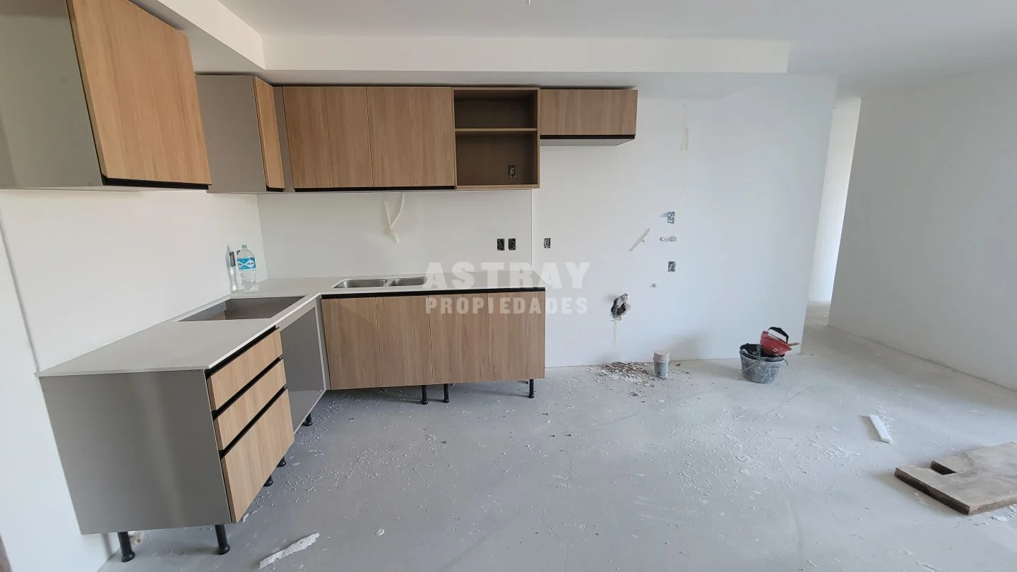 Living comedor con cocina semi integrada con placares aéreo y bajo mesada.
