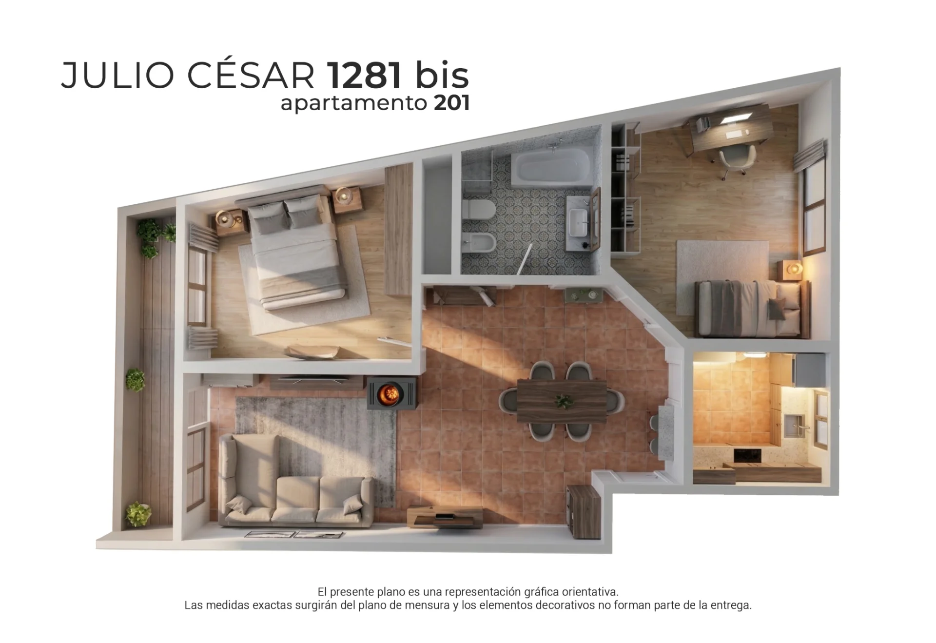 El apartamento cuenta con 2 amplios dormitorios, el principal al frente con orientación este y el otro al contrafrente con orientación oeste. Entre ambos, se ubica el baño completo, con bañera y espacio para el lavarropas.