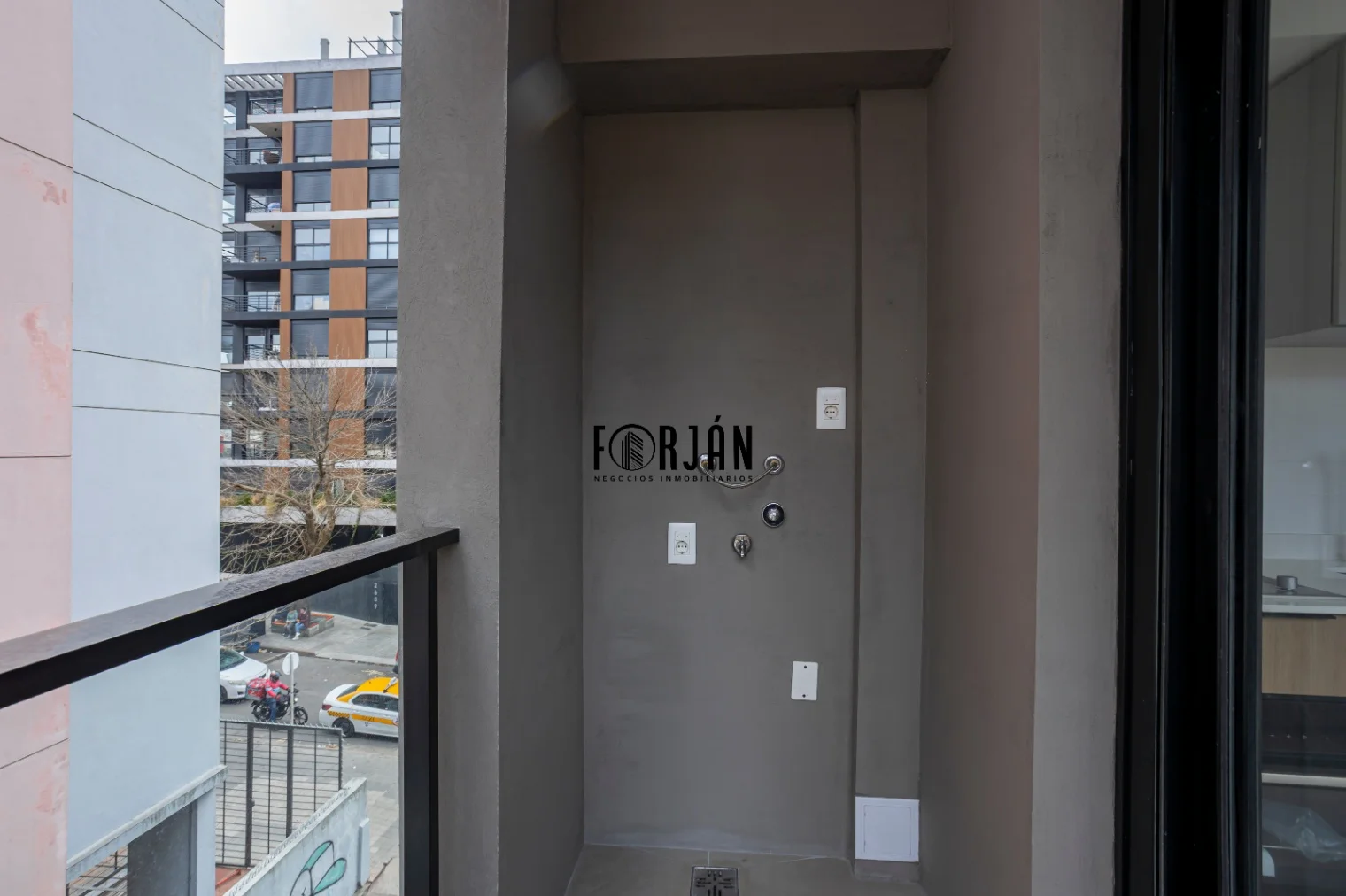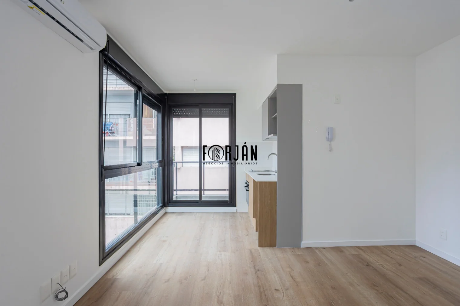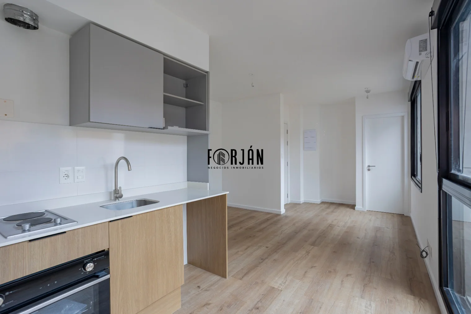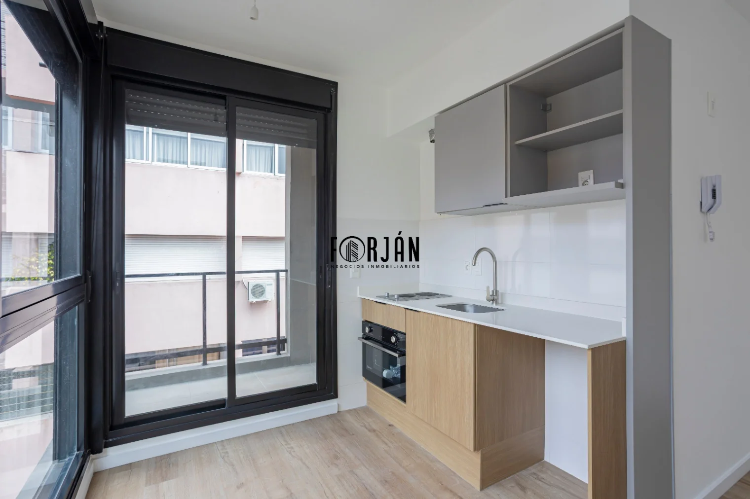 La cocina integrada está equipada con muebles aéreos y bajo mesada de diseño contemporáneo, además de contar con anafe y horno empotrado. El apartamento incluye un baño completo y balcón con conexión para lavarropas, un detalle que aporta comodidad y funcionalidad.