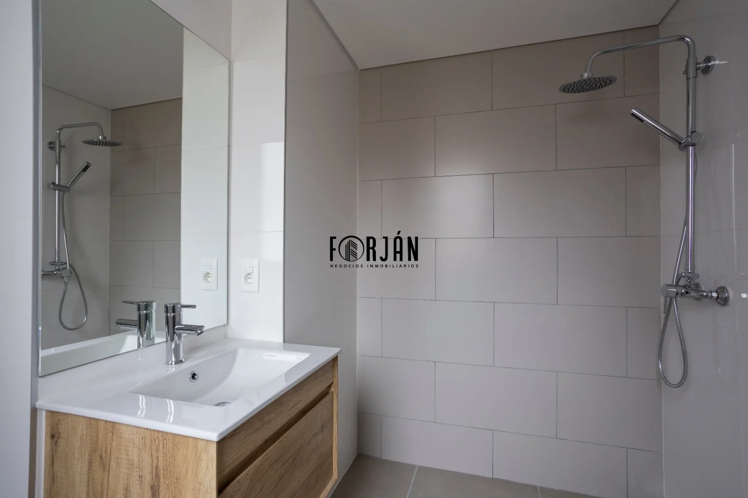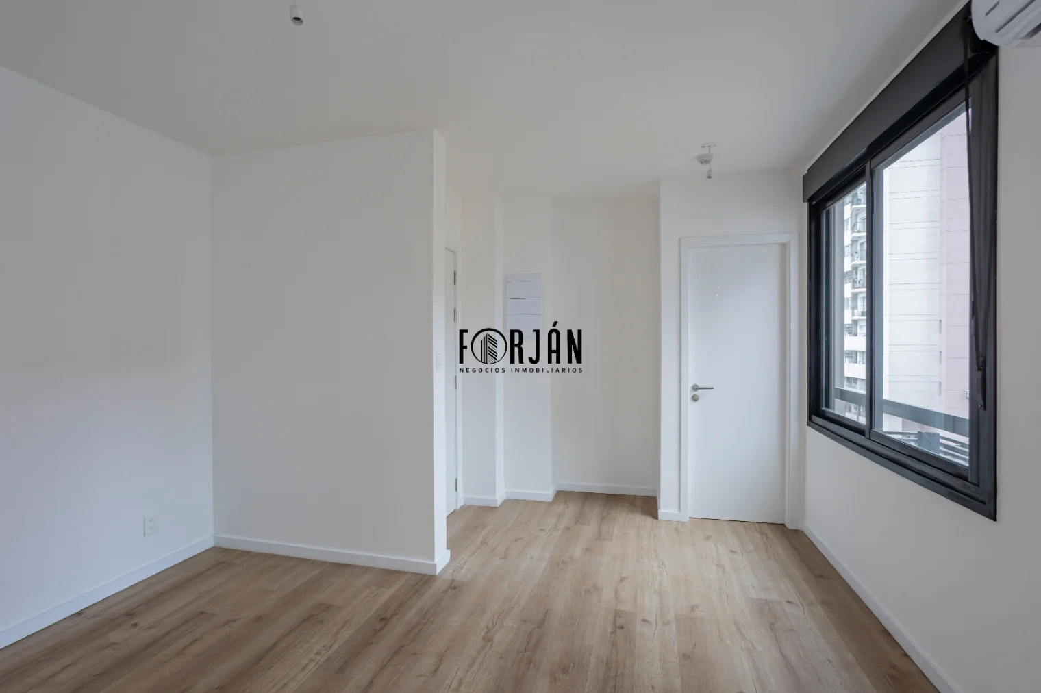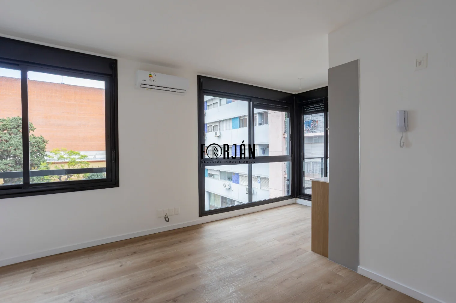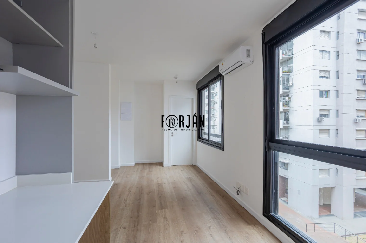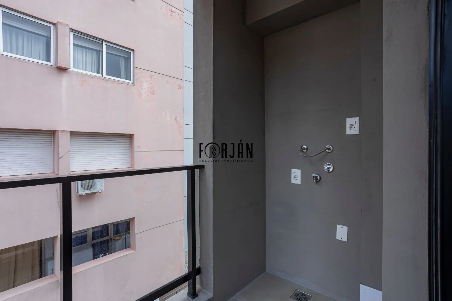 La cocina integrada está equipada con muebles aéreos y bajo mesada de diseño contemporáneo, además de contar con anafe y horno empotrado. El apartamento incluye un baño completo y balcón con conexión para lavarropas, un detalle que aporta comodidad y funcionalidad.
