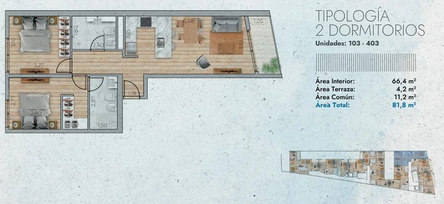 tipología con living comedor al frente, con terraza. dos baños y dos dormitorios, poryecto de muy buen nivel, con finas terminaciones.