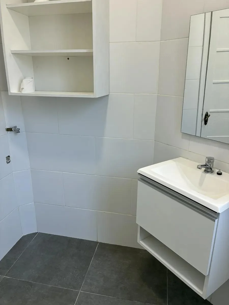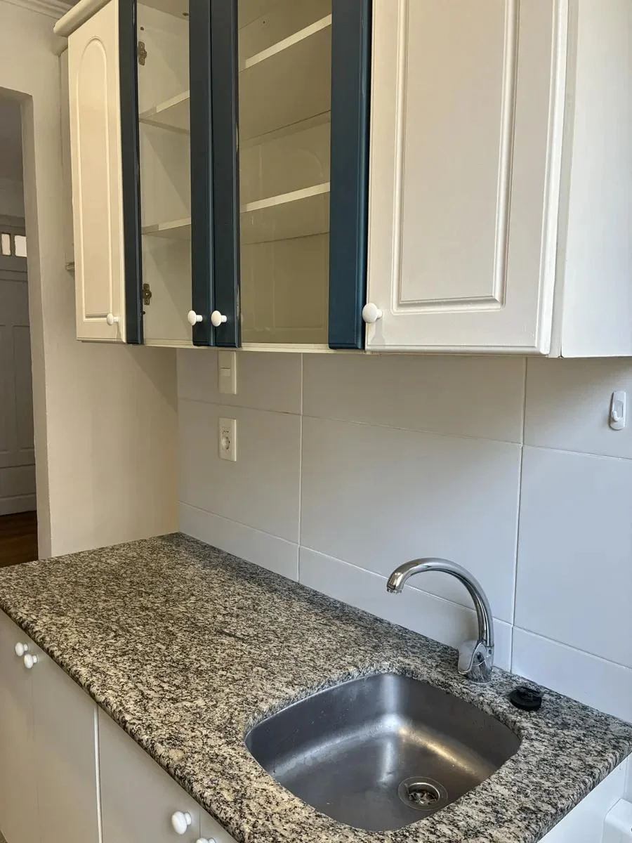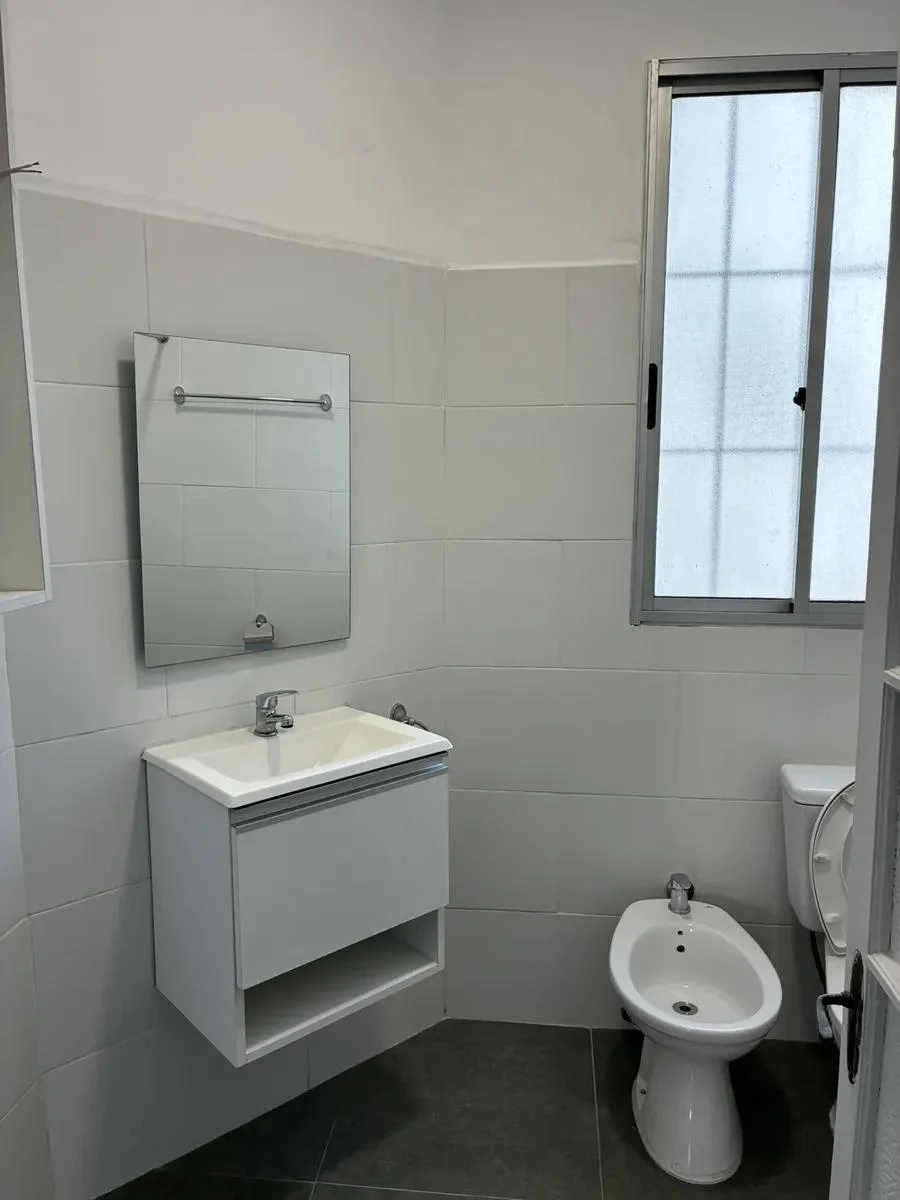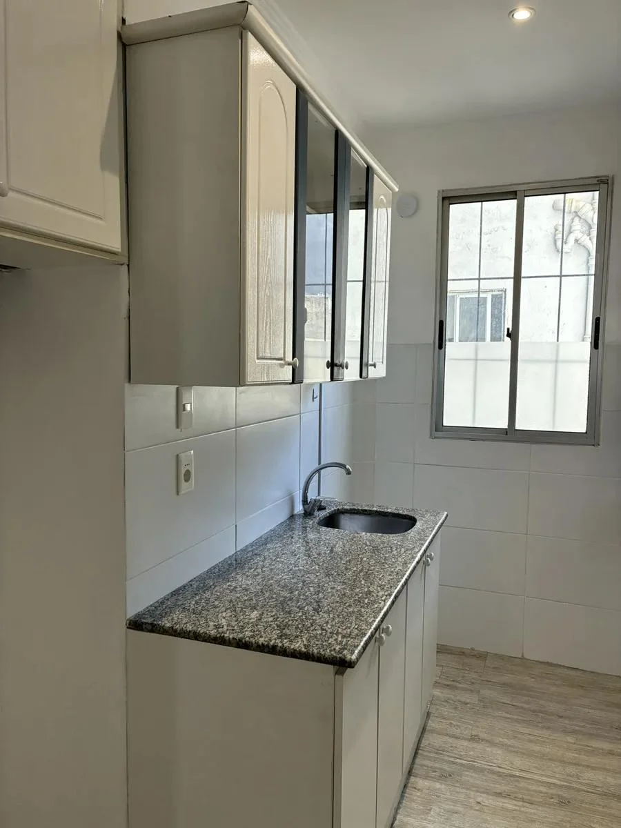La cocina es amplia y muy práctica, con numerosos placares sobre y bajo mesada, espacio para heladera, conexión para extractor, área para cocina y espacio específico para garrafa. Presenta piso vinílico en excelente estado. El baño es completo, cómodo y cuenta con conexión y desagüe para lavarropas.