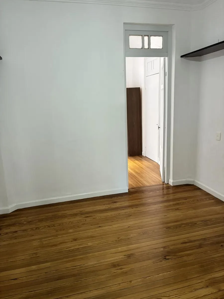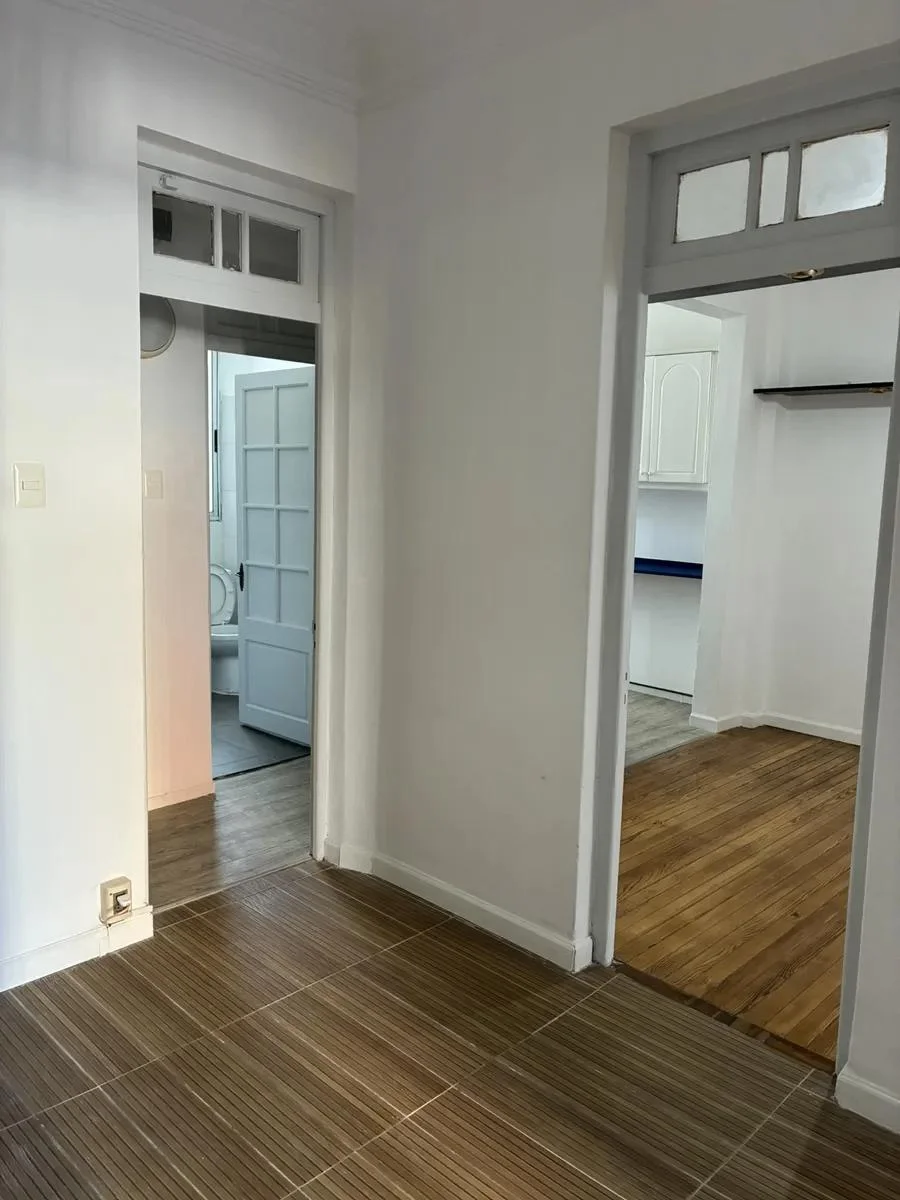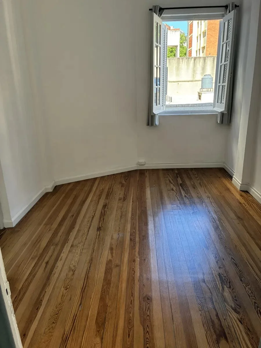 La unidad cuenta con dos dormitorios al frente, con ventanas de madera, postigos y herrajes de bronce. Los pisos originales de pinotea fueron pulidos y plastificados. El living y el comedor son ambientes independientes: el living con piso de cerámica y el comedor con piso de pinotea, generando espacios cómodos y funcionales.