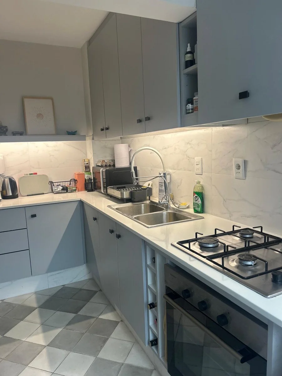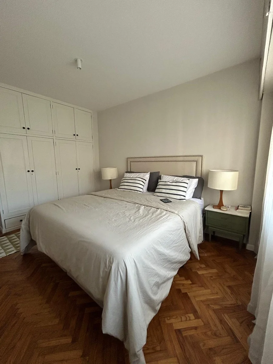 El apartamento cuenta con tres dormitorios, uno de los cuales está actualmente integrado a la cocina, pero puede cerrarse fácilmente si se desea. Además, dispone de dos baños, uno completo y otro social, ambos renovados en 2022. La cocina ha sido reciclada en su totalidad el mismo año y cuenta con amplios placares, alacena, mueble lavadero y salida directa al patio lavadero. La instalación de lavarropa y caldereta a gas añade funcionalidad al espacio. Aunque no cuenta con garaje propio, se alquila una cochera en el edificio por $4,500 al mes.