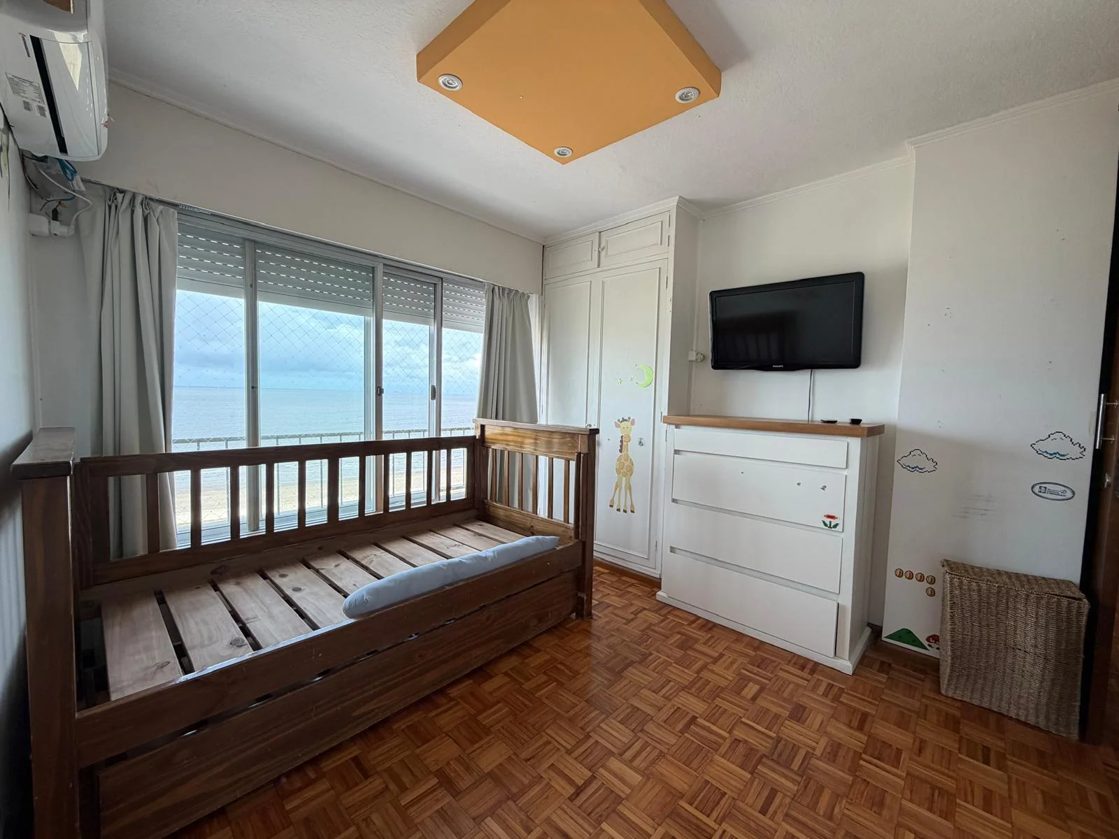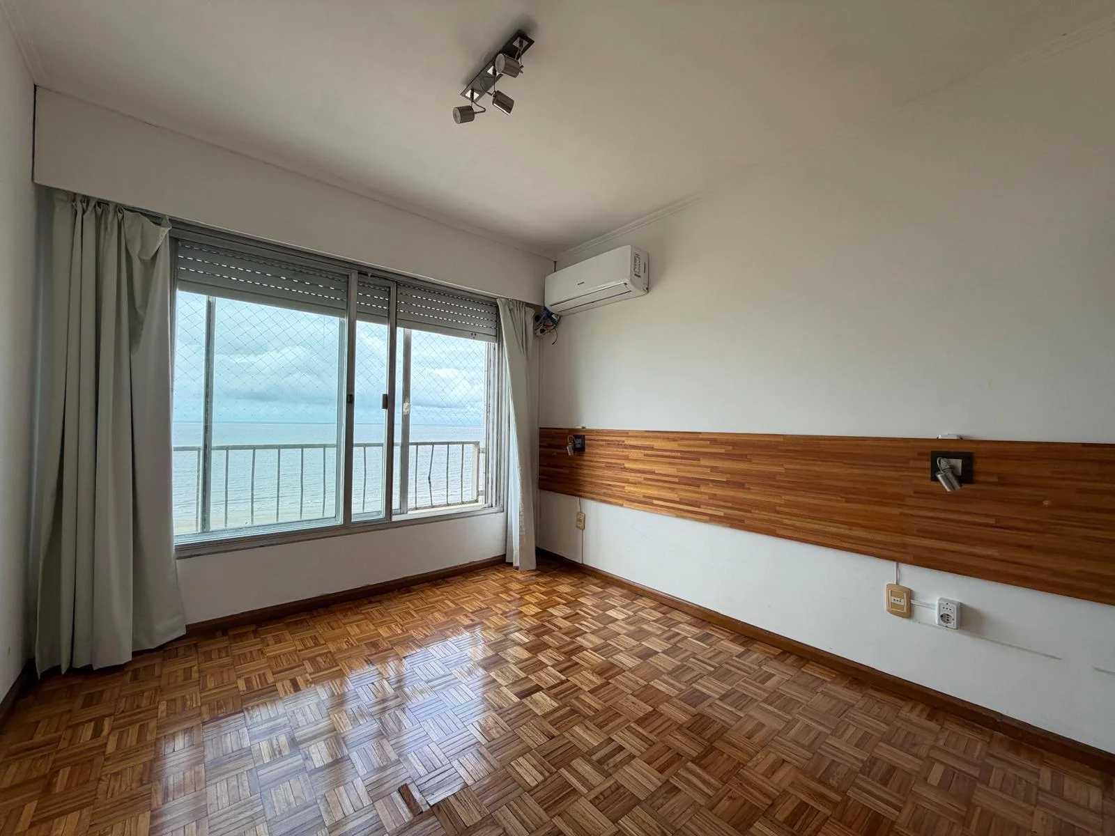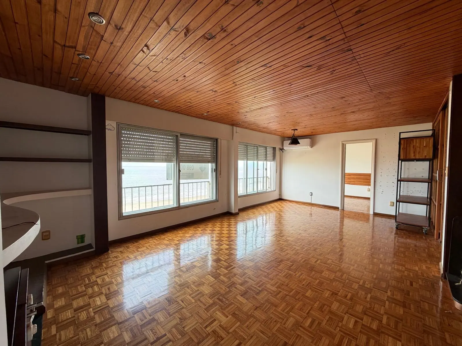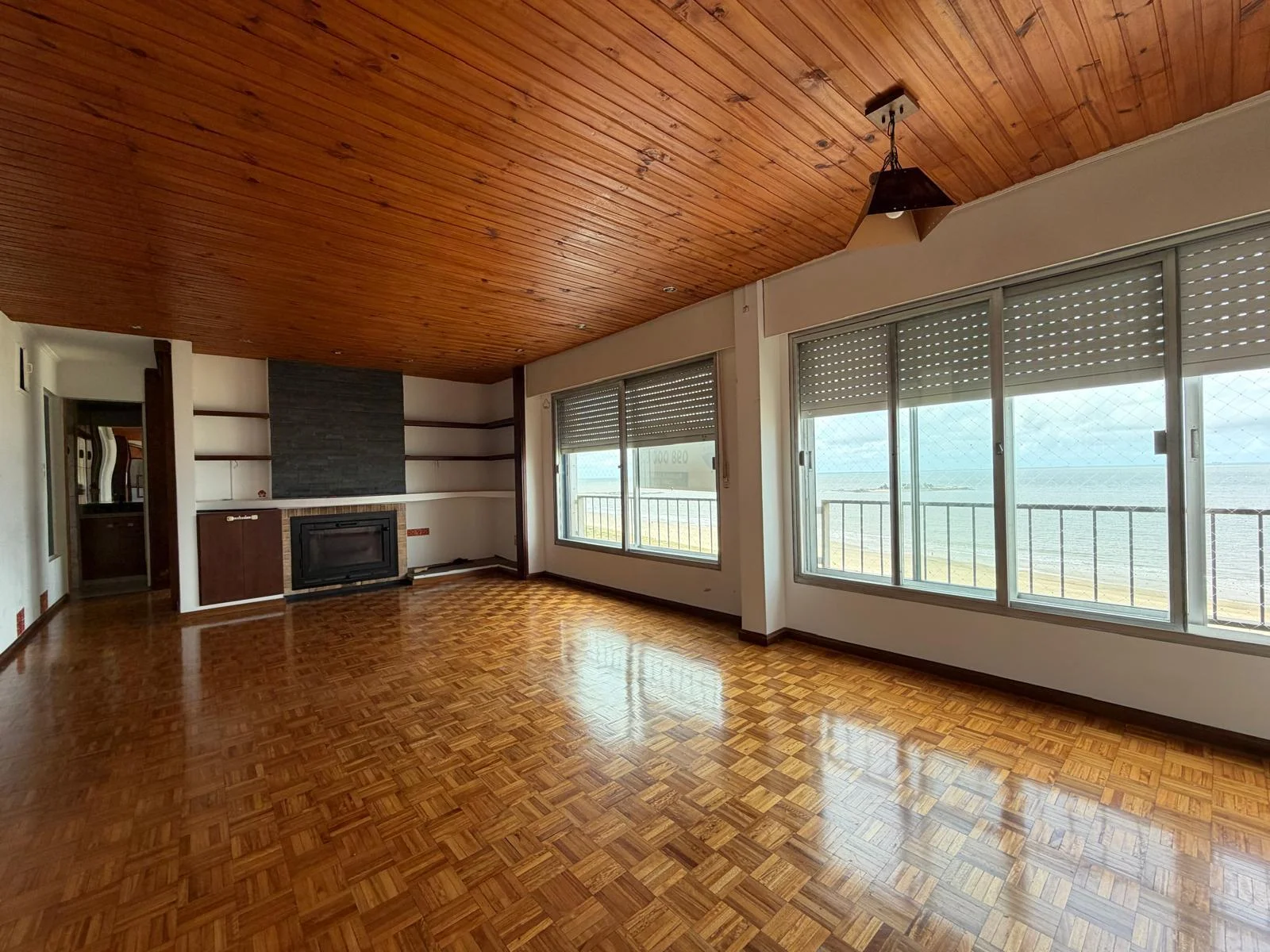 El living comedor es el centro de gravedad de la unidad. Amplio, con chimenea funcional, pisos de parquet plastificado y una apertura visual hacia la rambla que convierte cada momento del día en una experiencia distinta según la luz y la marea. En invierno, la estufa a leña y la calefacción por loza hacen del espacio un lugar de refugio real. En verano, la terraza toma el protagonismo.