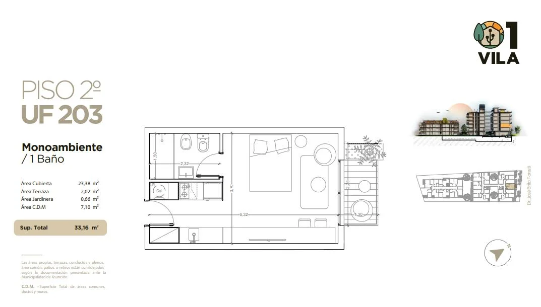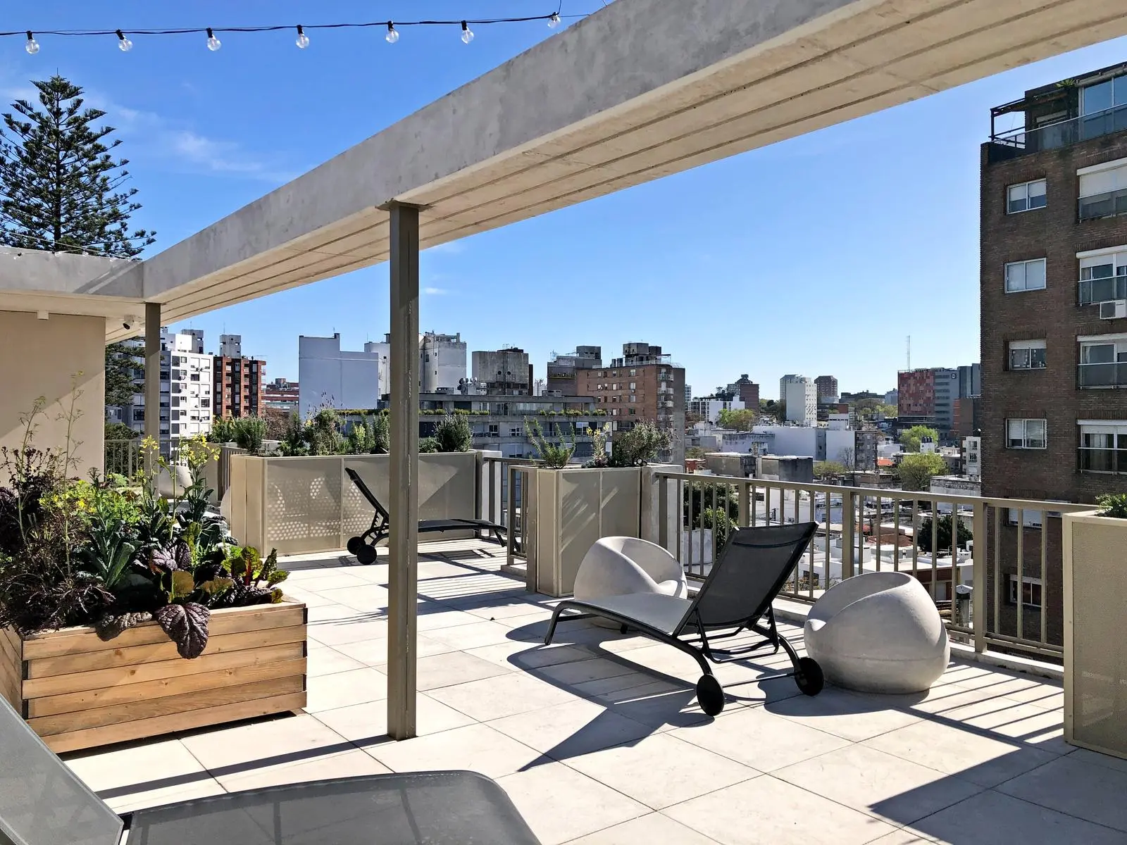 Monoambiente en segundo piso al frente con terraza exterior con vegetación incorporada.