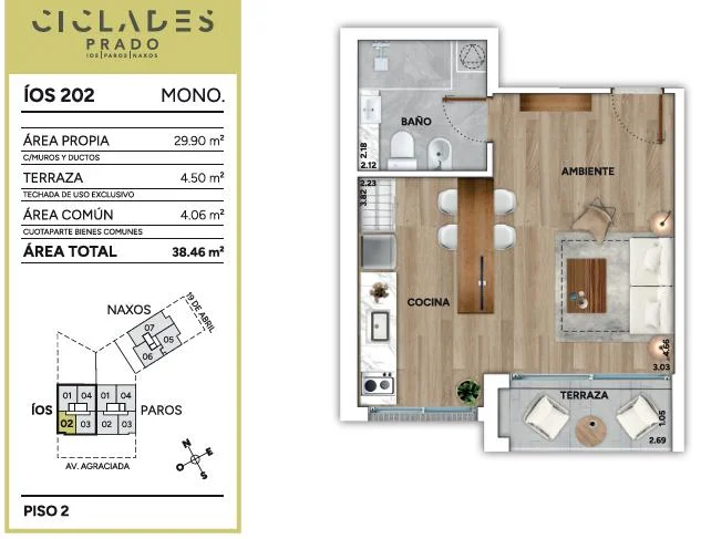 Cíclades Prado es un condominio de tres edificios de planta baja y tres pisos, (ÍOS, PAROS y NAXOS, implantado en un predio que atraviesa la manzana y le abre frente a dos avenidas icónicas del barrio: Av. Agraciada y Av. 19 de Abril.