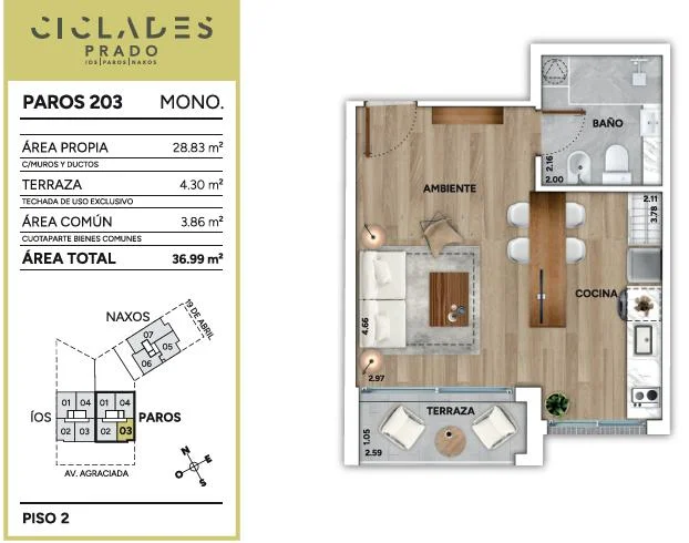 Cíclades Prado es un condominio de tres edificios de planta baja y tres pisos, (ÍOS, PAROS y NAXOS, implantado en un predio que atraviesa la manzana y le abre frente a dos avenidas icónicas del barrio: Av. Agraciada y Av. 19 de Abril.