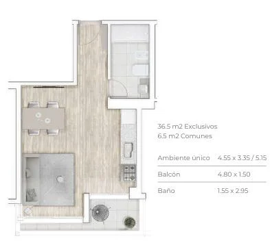 Monoambiente con cocina integrada y amplia terraza. Baño Completo.