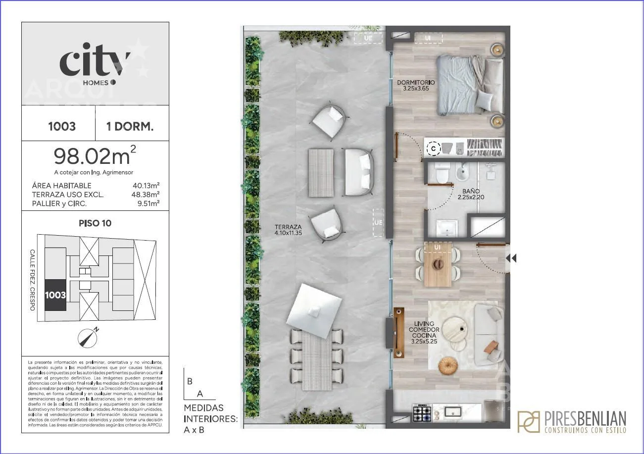 Living comedor con terraza al frente de 48 m2, cocina integrada con placares, 1 dormitorio al frente, 1 baño completo.