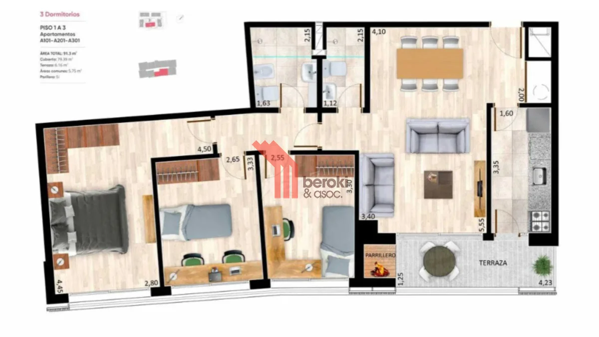 Además, el apartamento cuenta con 2 baños completos, un gran living comedor de 45m2, cocina definida con muebles sobre y bajo mesada de Cuarzo y campana extractora.