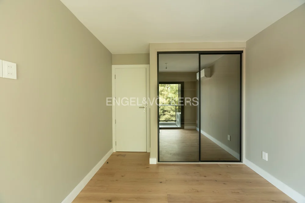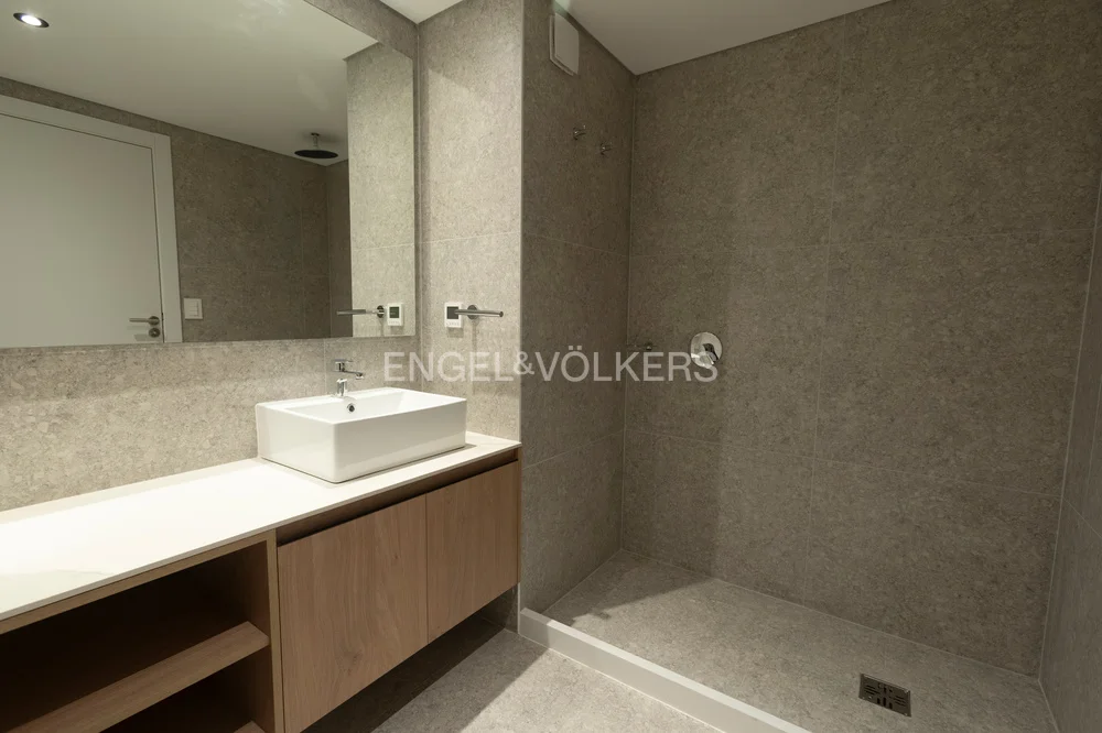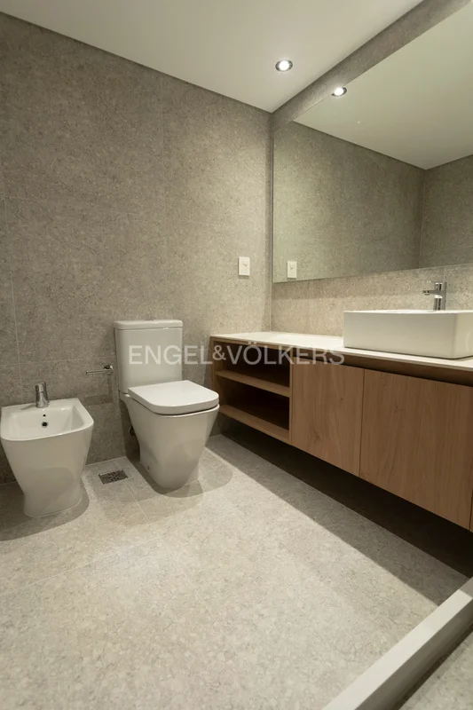 El corredor a los dos dormitorios cuenta con un baño completo. Y termina en el dormitorio principal que cuenta con vestidor y baño en suite. Ambos dormitorios con ventanales hasta el piso tienen salida a una terraza común continua en todo el frente. En el caso de aptos de 1 dormitorio el baño es igualmente amplio, revestido en cerámico importada y contando con mueble de baño con mesada, espejo y un duchero de generosas proporciones.