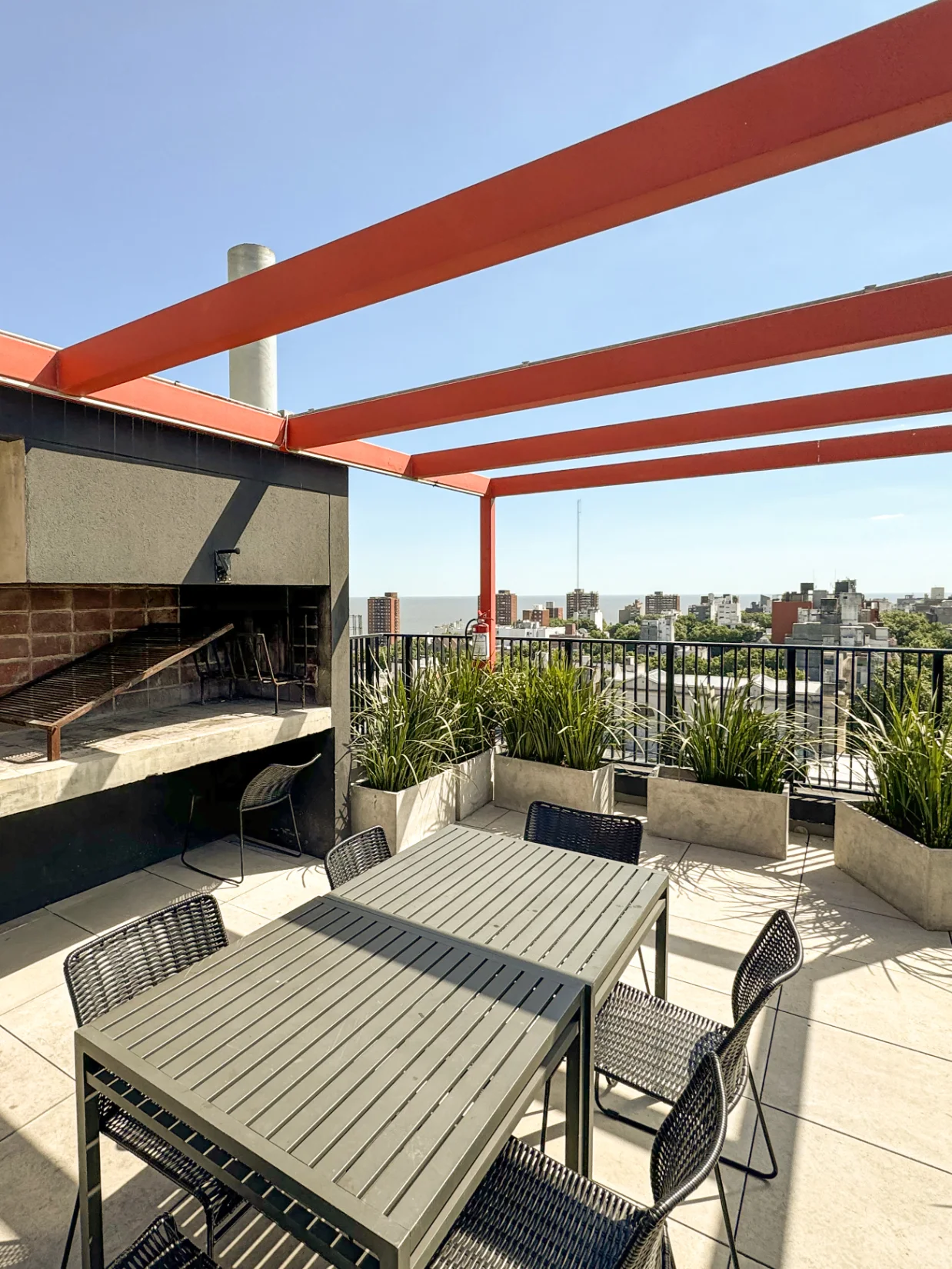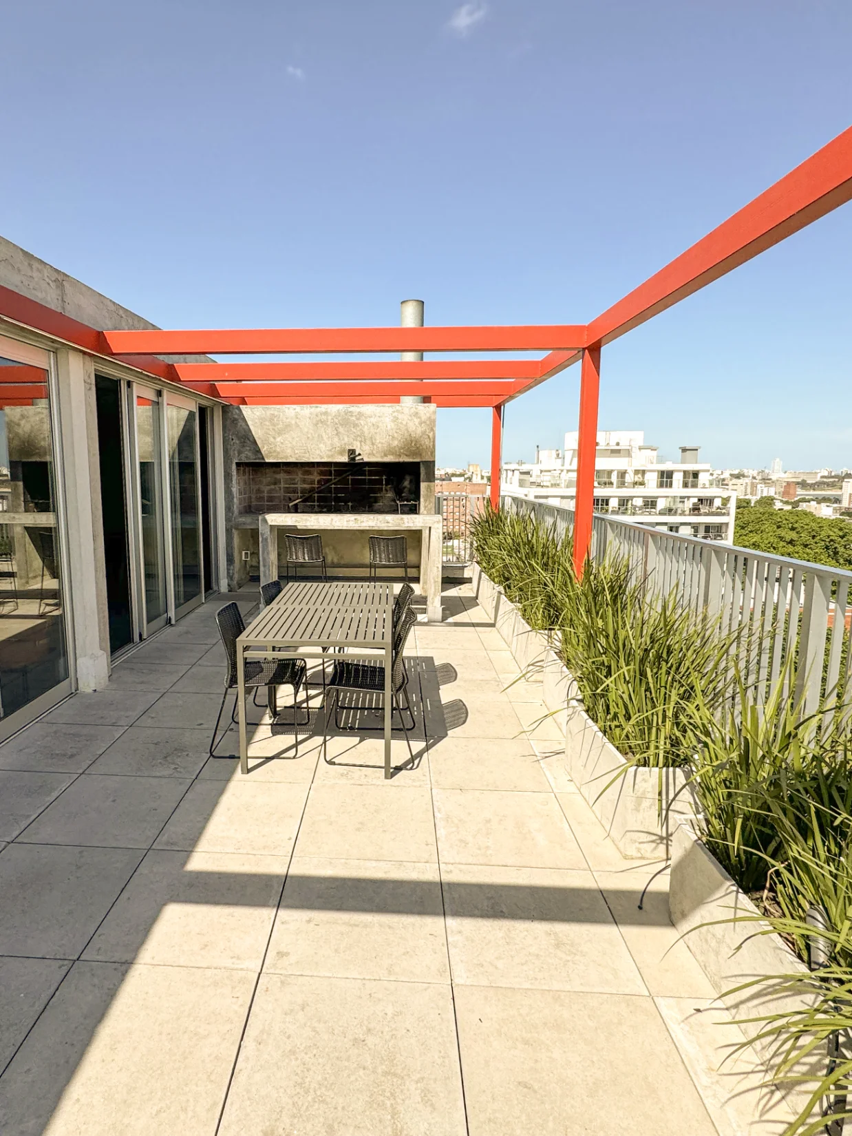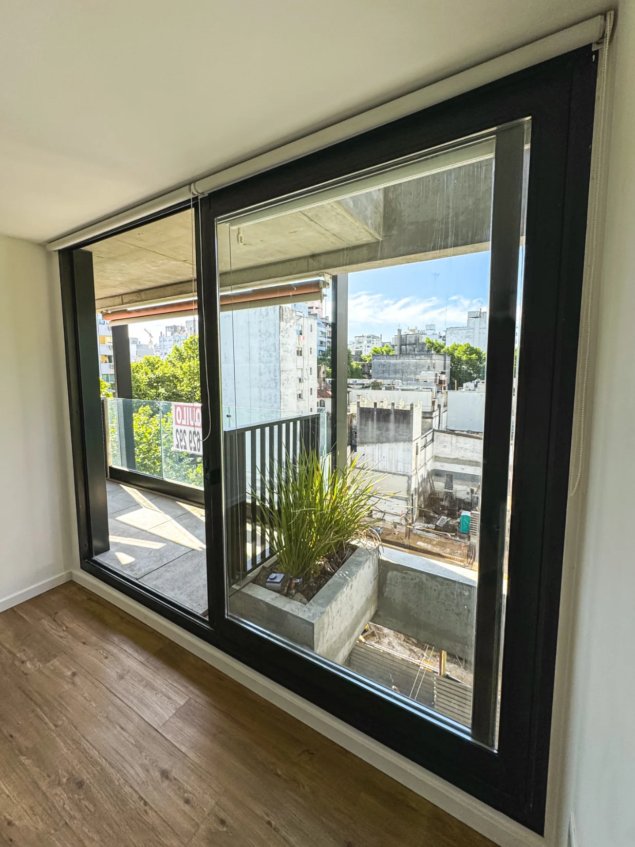 El estar comedor se orienta al norte, cuenta con una gran puerta-ventana de vidrio doble que conecta al balcón, tiene muy buen comportamiento térmico y le ingresa sol todo el año. También cuenta con dos cortinas black-out interiores y previsión de instalación de aire acondicionado.