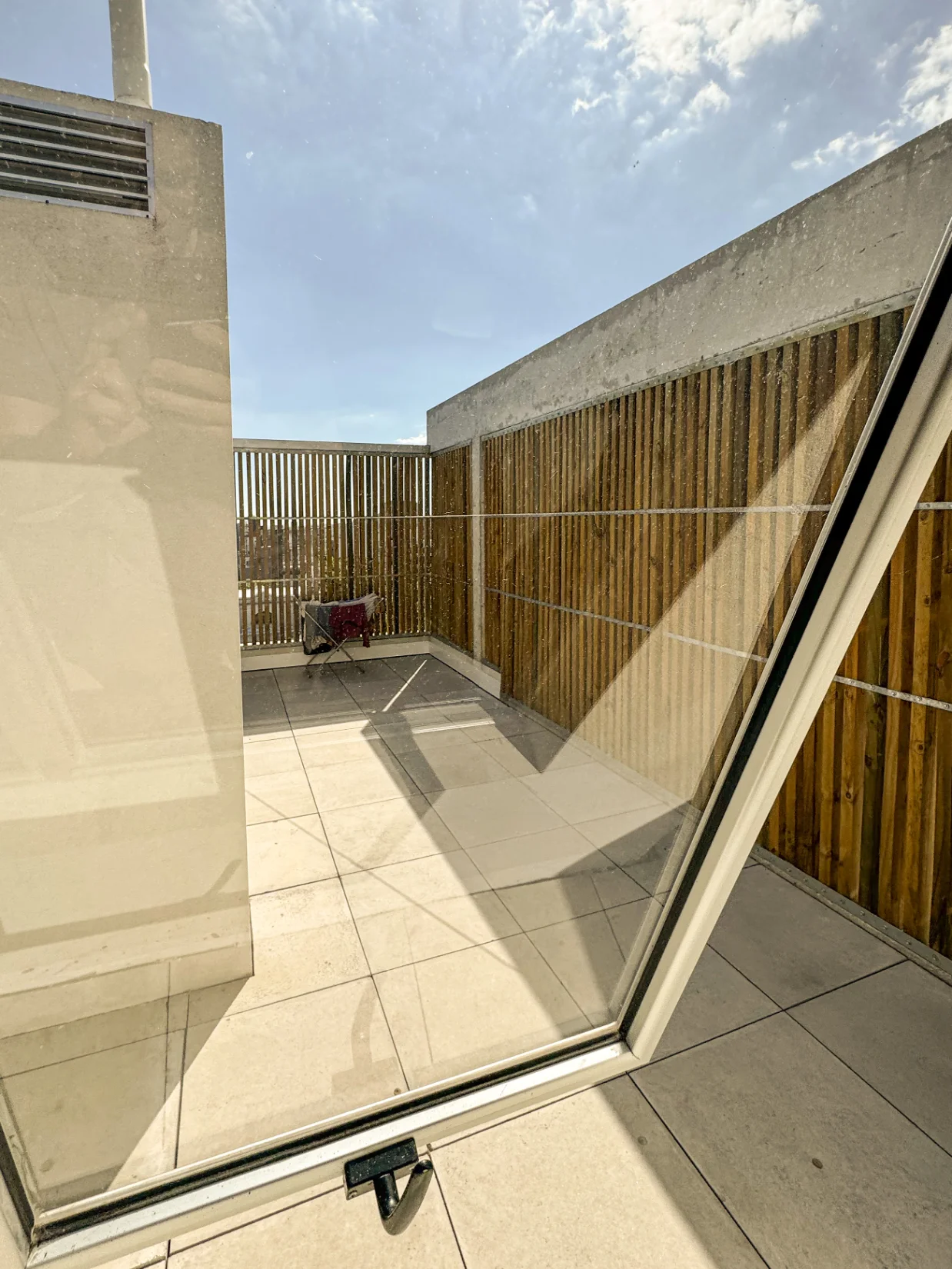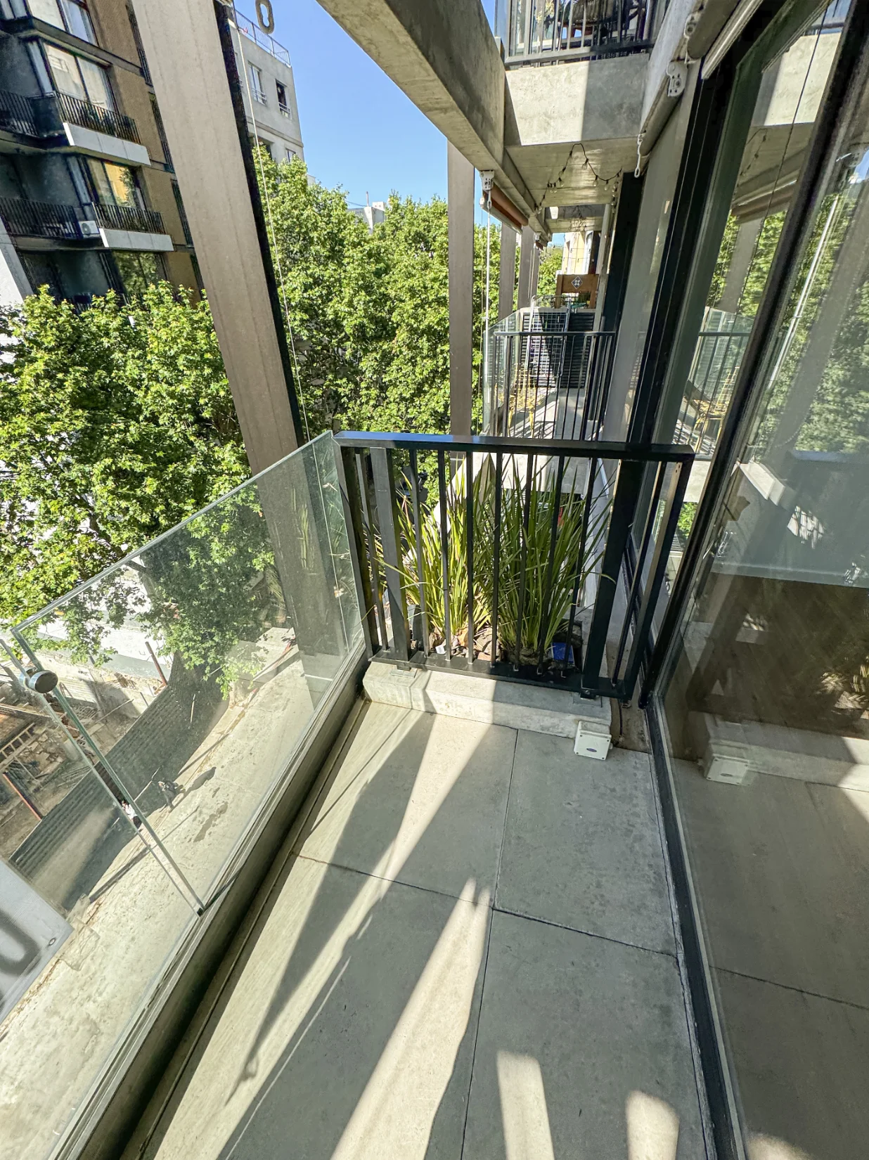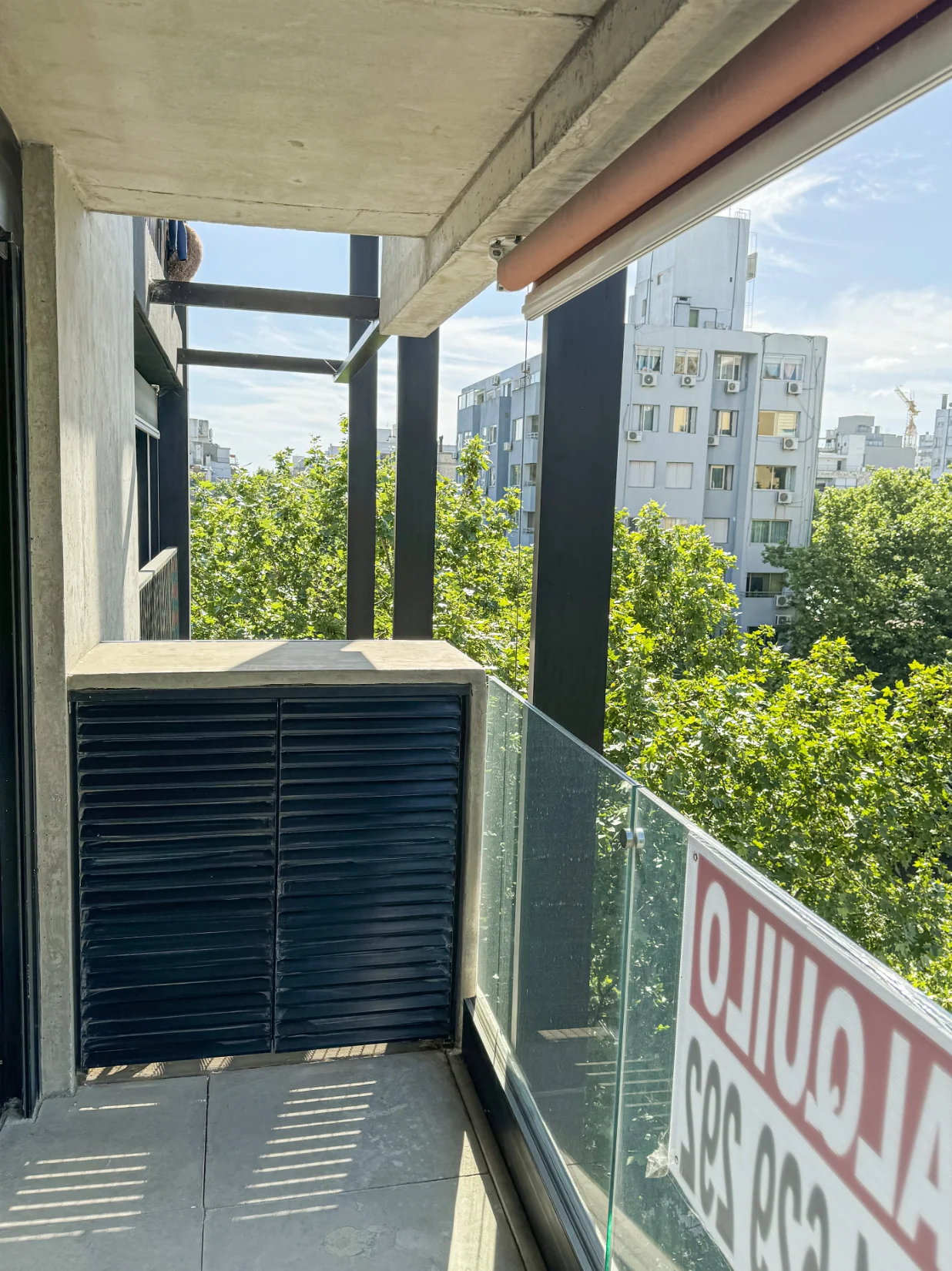El balcon es 3m x 1m, cuenta con una maceta de regado automático, dos cortinas de enrollar de sombra exterior y un espacio oculto de facil acceso para instalar dos aires acondicionados.