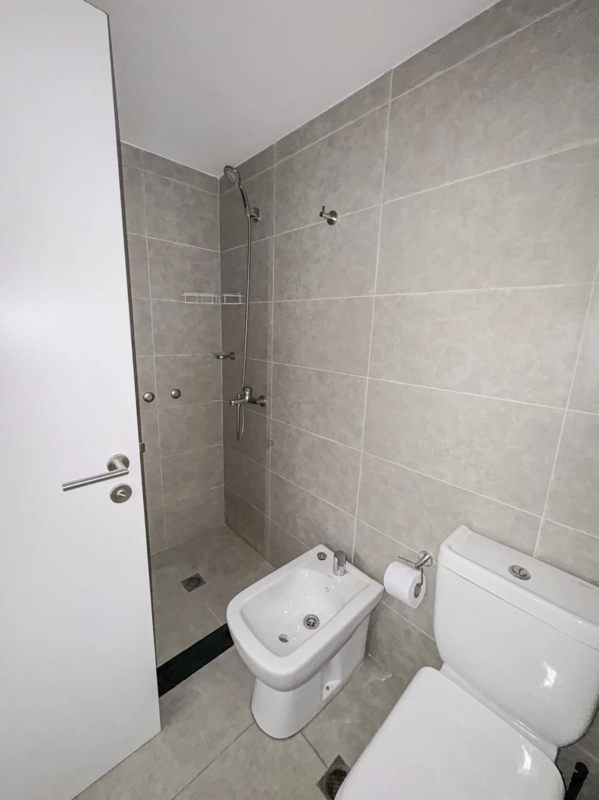 El baño cuenta con una ducha espaciosa, inodoro de mochila, bidet, lavamanos con mono-comando y espejo.