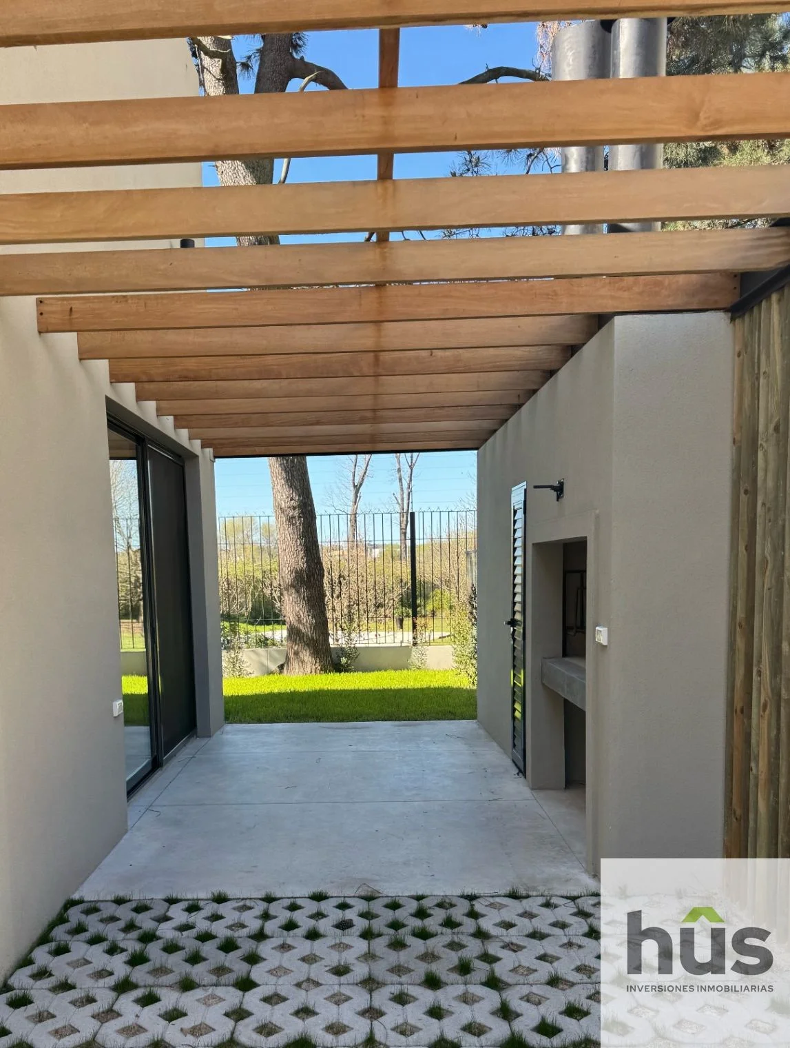 Living-comedor con cocina integrada, baño social y salida directa al jardín y parrillero.