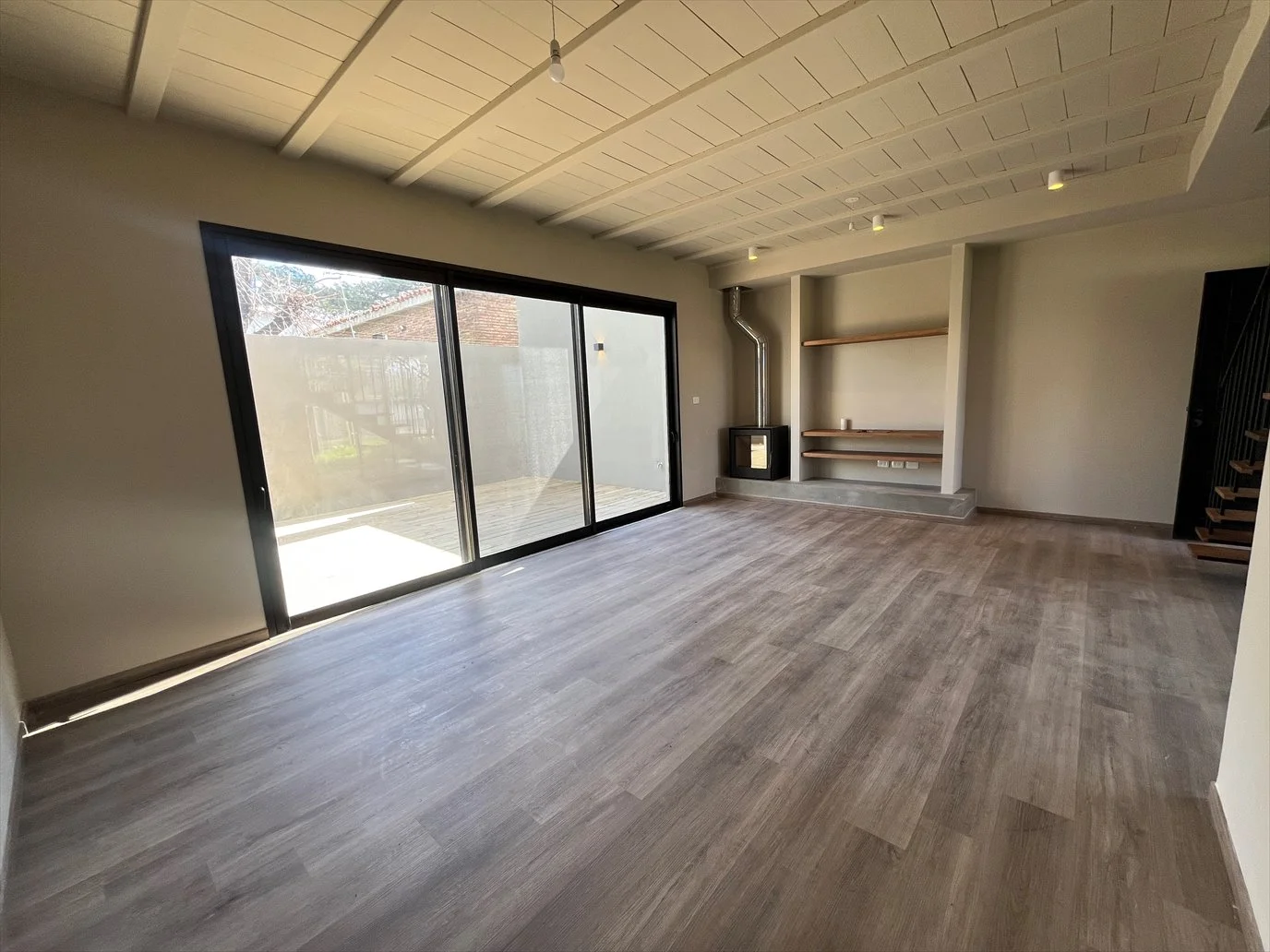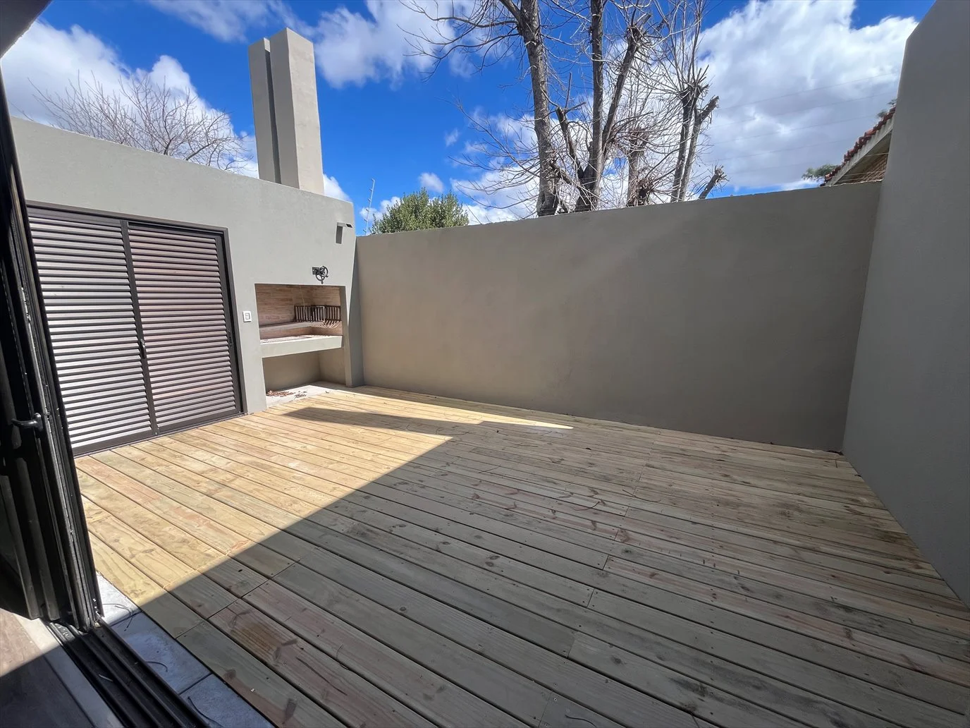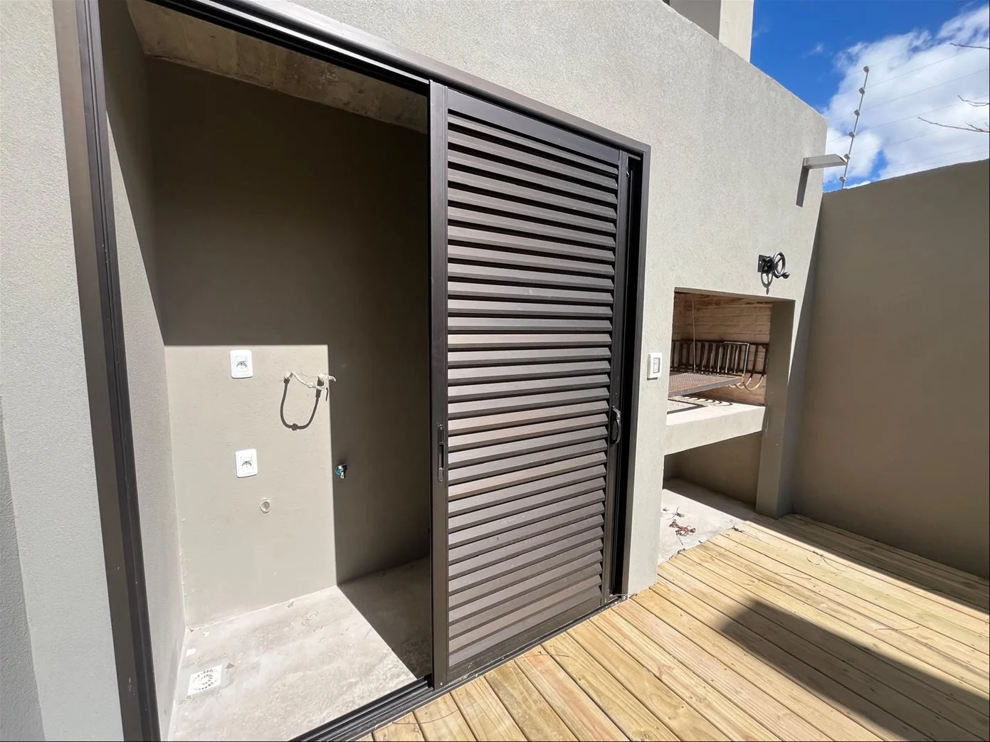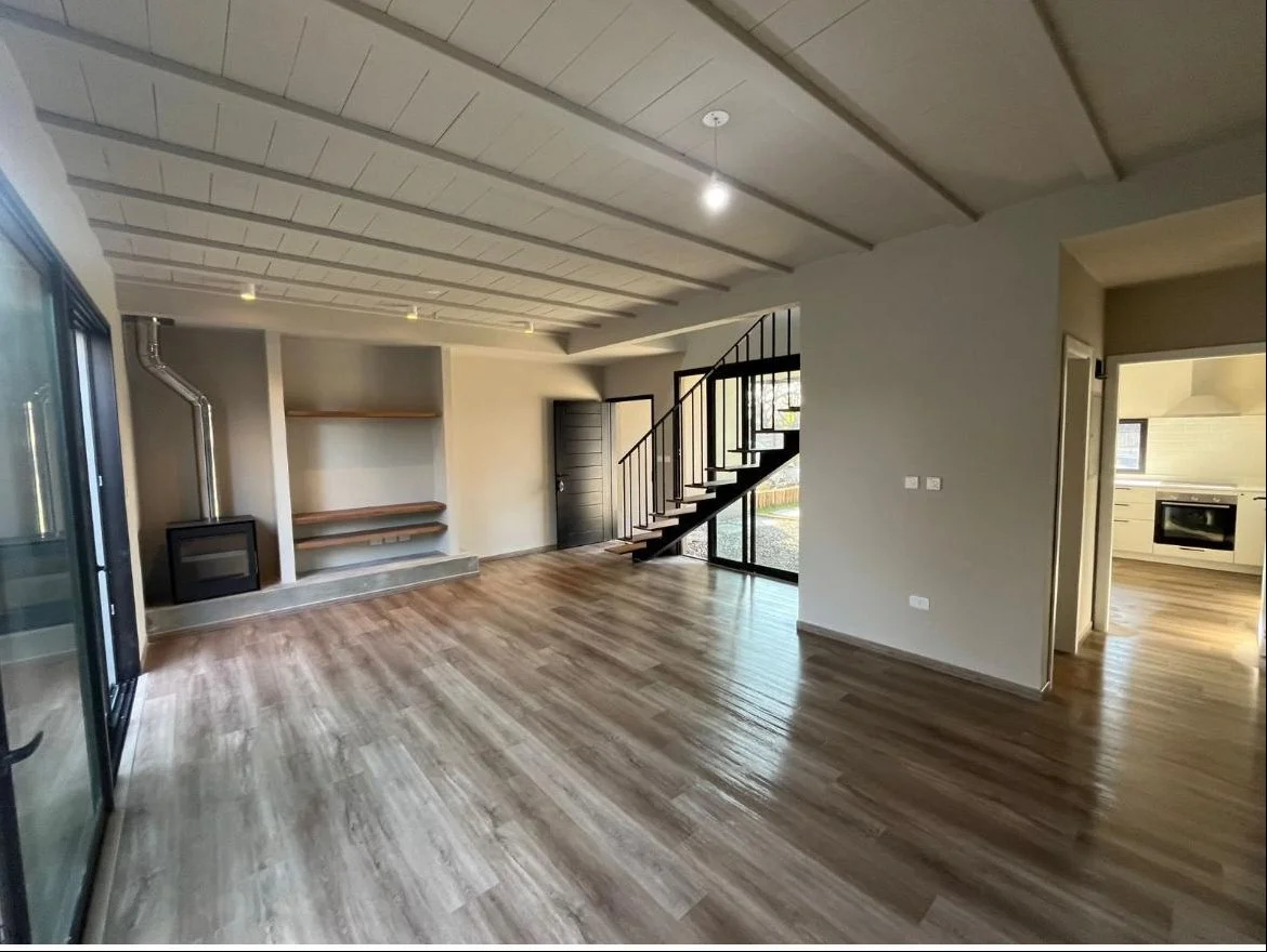 Living comedor con estufa de alto rendimiento. Grandes ventanales con salida al deck con parrillero y box para lavarropa y secarropa.