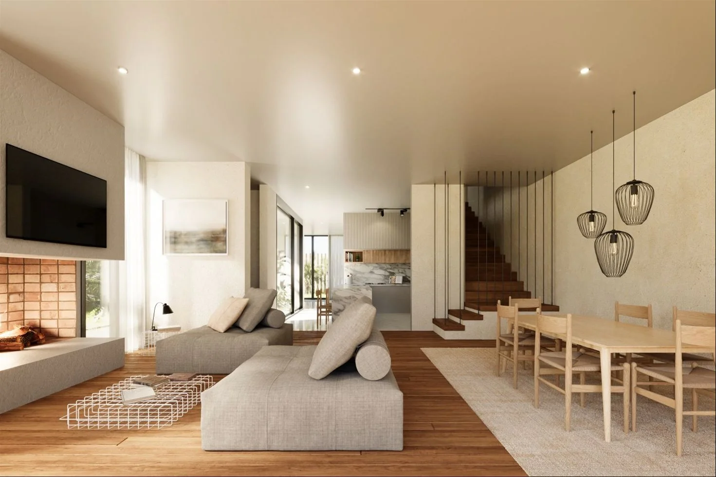 En planta baja, dispone de tres ambientes: estar independiente, escritorio (o cuarto dormitorio) y un amplio living comedor con cocina semi integrada.