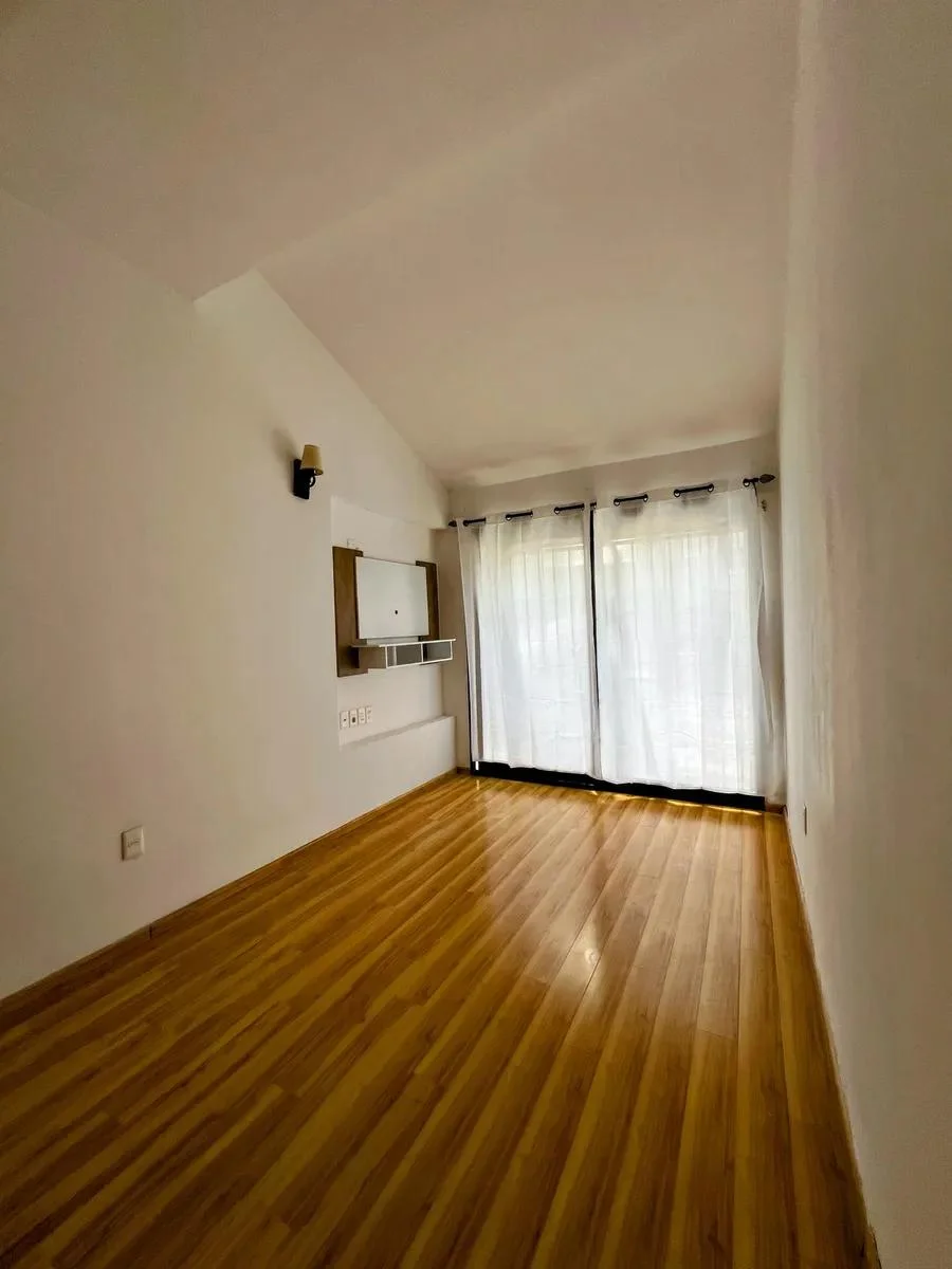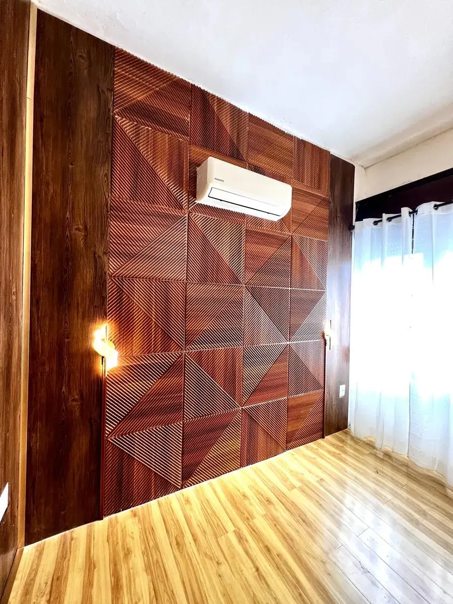 Dispone de dos dormitorios amplios, ambos con placares, aire acondicionado, pisos flotantes de madera y cortinas instaladas. El dormitorio principal incluye rack para televisión, apliques de luz led de pared y un artefacto central con revestimiento en madera, generando un ambiente muy acogedor. El living comedor integrado cuenta con aire acondicionado, pisos cerámicos, espejo grande de pared, revestimiento en madera ripiada y cortinas, conformando un espacio cómodo y bien iluminado.